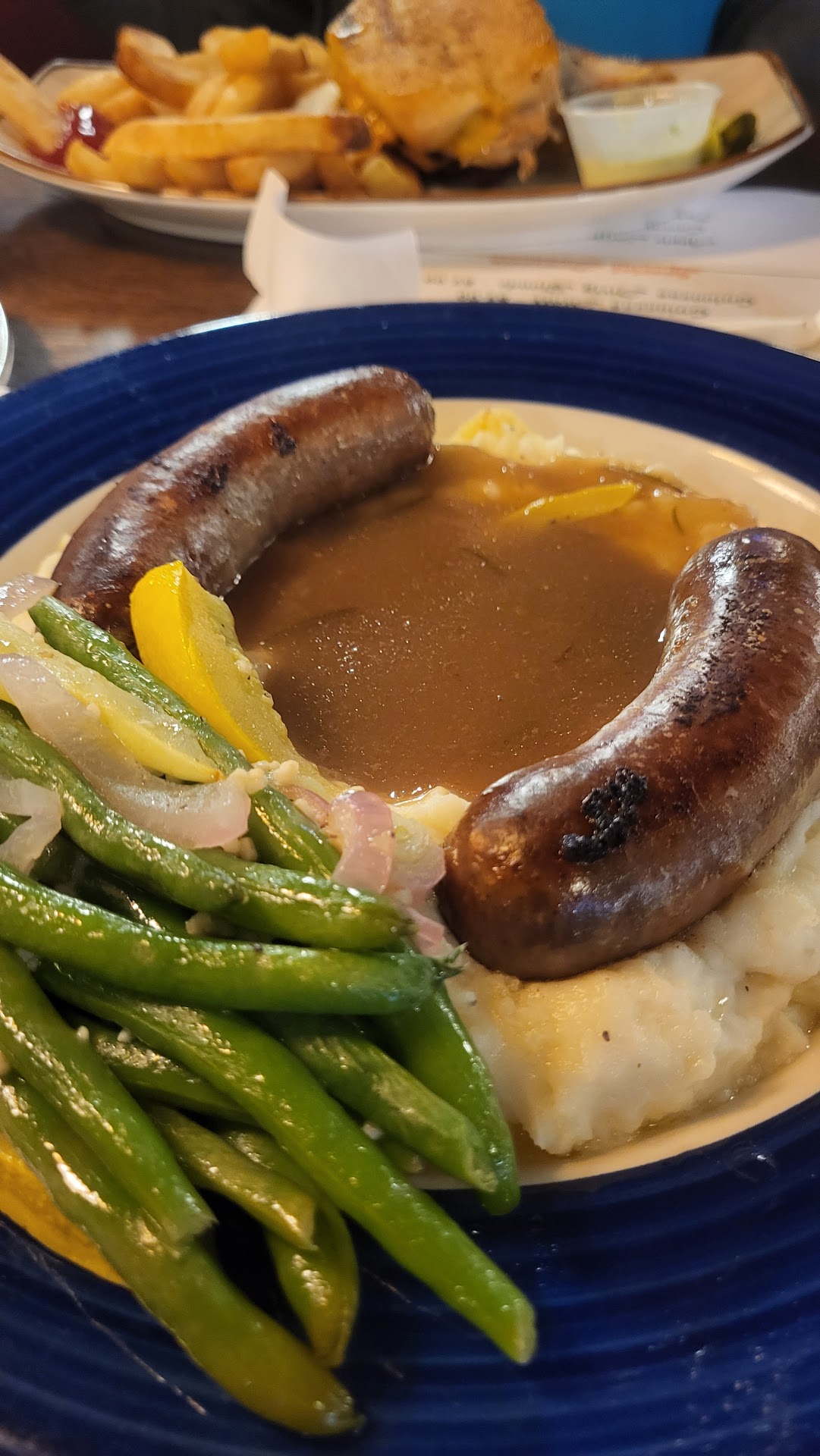 I ordered the bangers and mash along with a cup of Irish stew. It's usually pretty easy to tell proper Irish bangers (sausages) from inferior American efforts you find at grocery stores. The former will usually have the texture of a hot dog inside....not resemble a bratwurst which is what I had. The mashed potatoes and green beans that came with it tasted like a microwave meal. At least the service was good. (Great job Chloe)