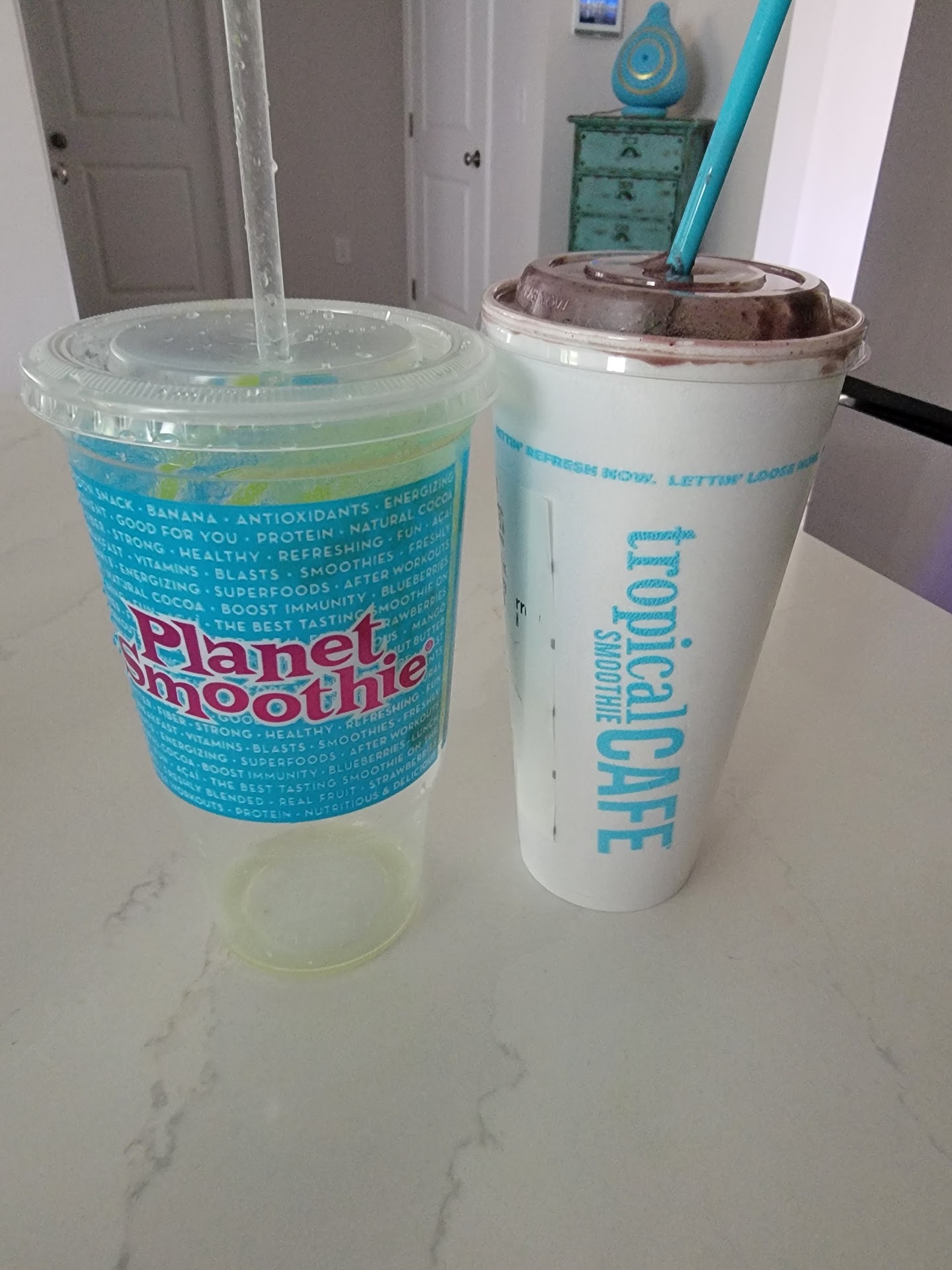 I have started going to Tropical Amoothoe which is 1.5 miles from my house, STILL uses Styrofoam cups, AND my smoothie could sit on the counter, my desk, or my living room table for hours without losing that icy, frosted consistency.