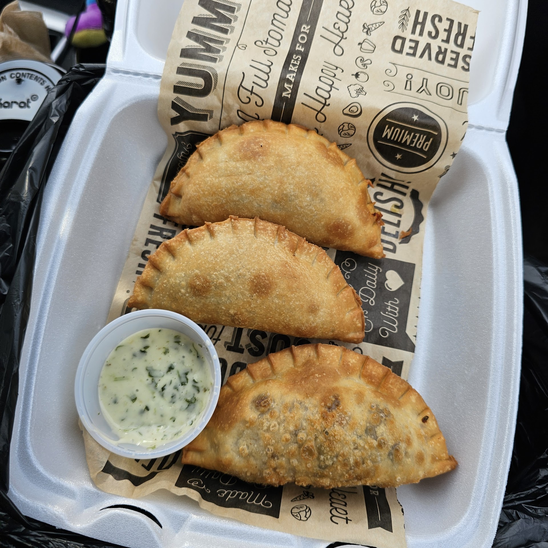 I informed the lady behind the counter of my empanada ignorance, and she was very helpful in guiding me to empanada Shangri-la. I ordered a basic beef and cheese, a boricua, and "The Godfather" in a three-empanada combo. For the dipping sauce, I tried the creamy and delicious cilantro garlic ranch.