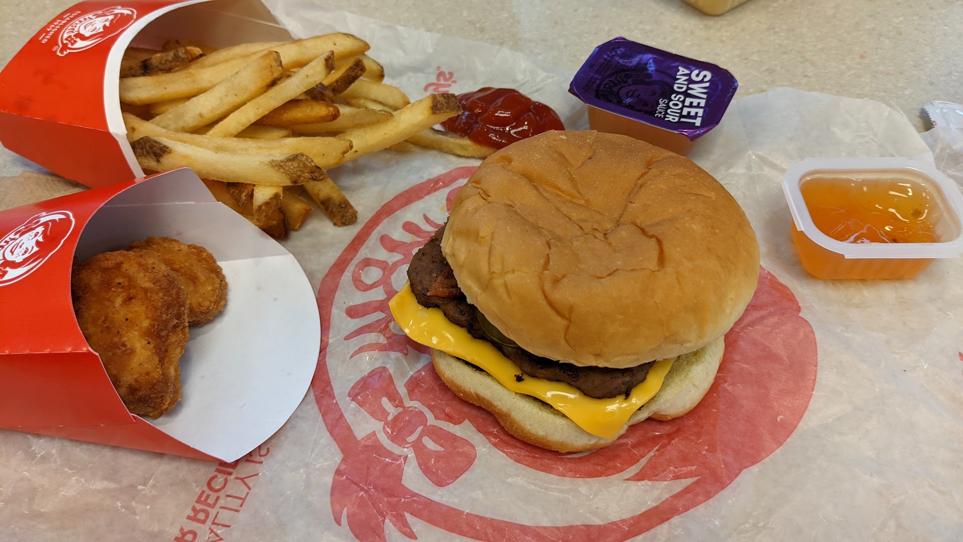 Suffice it to say what I got was a plain chicken sandwich with a medium fry, and a completely plain spicy chicken sandwich with a large fry and 10 spicy nuggets...