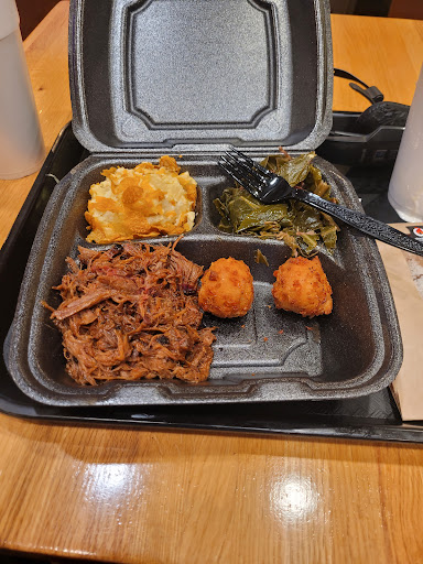 Order at the counter and pick a seat toting your own food. Asked if it were for there or to go. I dined in. But still put everything in a take out dish. So, plastic ware. Styrofoam cups. The difference between dining in and taking out was a tray or a bag. The interior was beautiful and clean. No bathrooms inside. I ate special sides. I had collards and cheesy taters. They were delicious. The pulled pork already came heavily with sauce. A sweet BBQ sauce. They had other sauces, but then you would end up mixing flavors. Prices were on the high side. The food was great. I ate it all but for the price of 18 and change for a half pound of pulled pork , 1 scoop of cheesy taters, and a small serving of collards. Would prefer making my own decision on sauce to put on my pork. No drink included. I had to purchase a separate drink, and I also got a shake. It was small for the price and I bought a specialty cookie to go. Bill just over $32. I felt like I was snubbed for not wearing a dress suit . I tried to comment on the food and the man walking around gave me a thumbs up n walked by to another table that had nicer clothes on and asking how they enjoyed the food and flavors. To say if I were to give them another chance idk. They do have a bit of truck parking on a busy highway. So I might give it another shot only...
