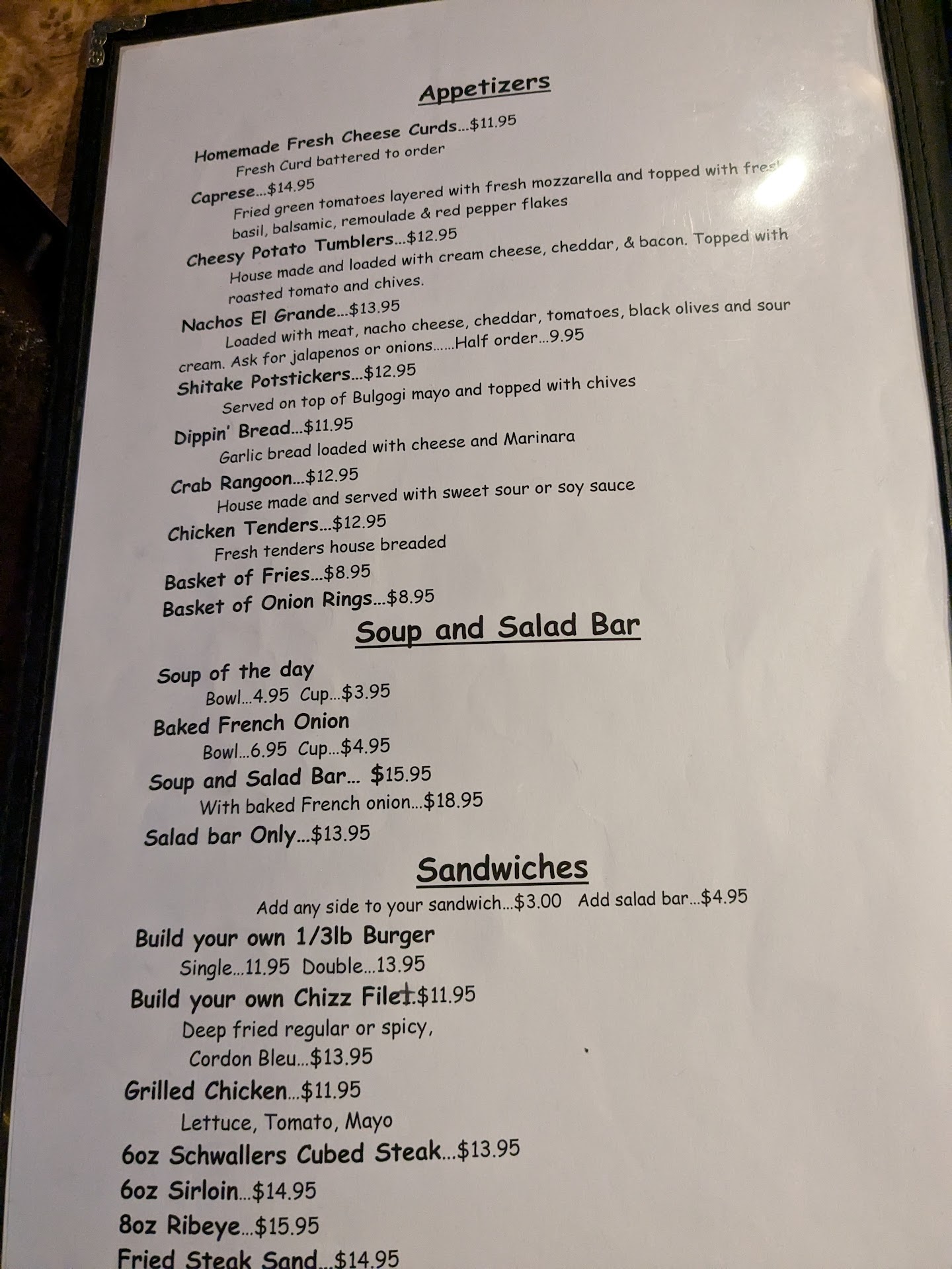 OMG. I'd start with the hostess, told us a 45 min wait, yet table after table after table wide open, makes one think they do that to make you spend at the bar. But we agreed, and we waited. The bar, the bartender was as friendly as a moldy piece of cheese, soda was flat and watered down, weak drinks, yet an expensive bloody Mary and only came with a pickle, had to ask for more garnishments. Appetizers, breaded califlower was acceptable, Spinach and artichoke dip was running, not very good, chips okay. Now onto the meal, after an hour wait, more waiting once at the table, spider webs and a very dirty table, three of the four of us had salad bar, which wasn't very stocked, cold vegetable soup, etc. I had the $30 Walleye, ate one bite, bones and the worse taste of fish ever, couldn't eat that, baked potatoe was excellent, daughter n law's steak was charred on the outside, raw in the center, asked for a new one, they basically brought back out the same one after cooking it even more, at least hers tasted like a steak, somewhat, son's $34 sirloin steak, we're not even sure what kinda meat that was, but it didn't even taste like steak, let alone a human consumable steak, so gross, his boasted potatoes were okay, wife's shrimp tasted fishy as well, never had breaded shrimp taste like that, but her boasted potatoes were empty, lol Overcooked. Needless to say, for $200+, we'll never return, nor would I ever recommend. I would avoid the place by all means possible, worse food I've had in years. For what we were charged....