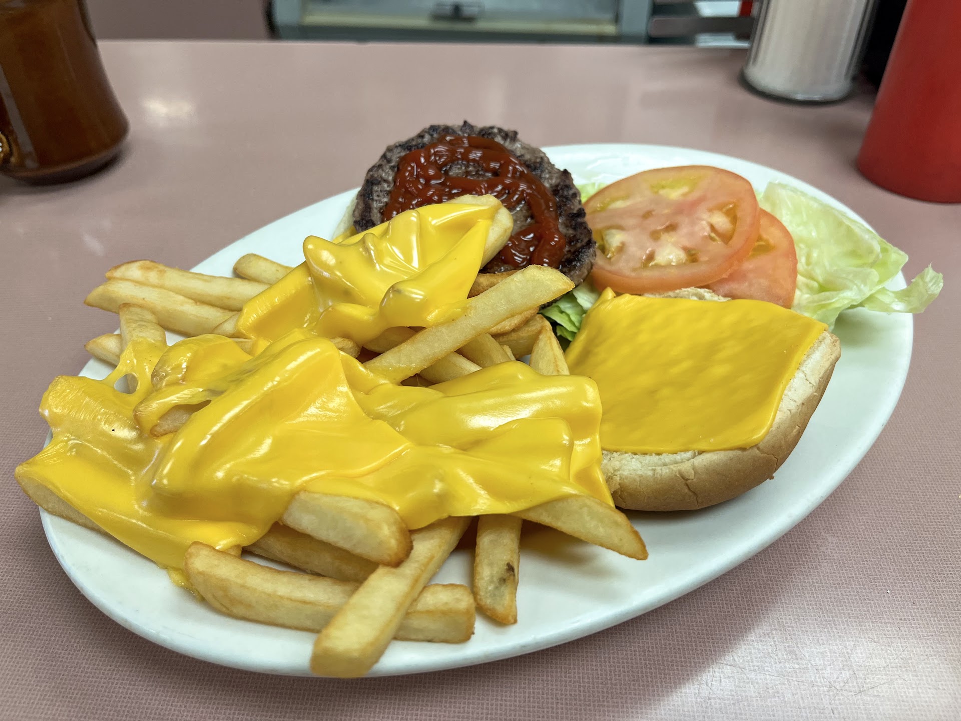 Never noticed this place before as it's in the middle of an old strip mall and unless you are looking for it, you just don't see it. I actually saw it on Google Maps and thought, what the heck is that place? I drove over for lunch. It's an old school diner ... a greasy spoon, and I say that in the most positive way. I loved it! It's very authentic and everyone in there has probably been there many times before, except me. Loved the waitress, although I didn't get her name. She was a hoot! We were talking about how it's good to try new places and she said, "So, where are you going to go?" I said, "here! I'm doing it now!" Haha. Anyway, the place is old but very clean and personally I loved the red covered stools and booth seats along with the vintage signs on the wall for Pepsi and Coke. Lots of Marilyn Monroe's and Elvis's, too. I had a simple cheeseburger and fries (with cheese) and a coffee. It was great, and the prices were extremely reasonable especially for this area! I usually spend $25-$30 on lunch and I spent $11. Cheaper than McDonalds, too ... so,...