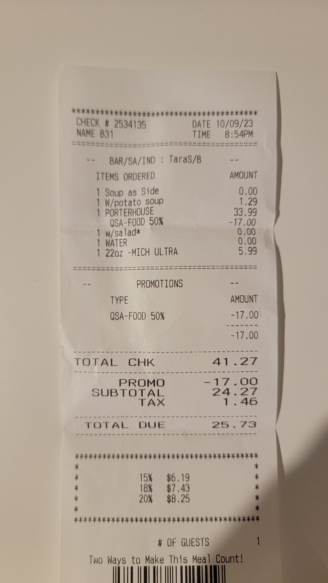 ā We sat for 15 min or so with zero service, host said our server would be coming, she finally came, waited another 10-15 min or so just for waters and rolls which we ended up asking the host for. ā Our server did not introduce herself, her greeting was āThey just gave me 3 tables.ā We never learned her name, Kadijah, until we saw it on our receipt. ā Visited the host 3 times to ask for the football game to be turned on, no resolution. At the end of our meal another table got the game turned on and were cheering when someone came to turn it on, so clearly was high demand ā Whenever our server came she auctioned our drinks and food off at one side of the table. My family member received a 22oz beer instead of 16oz, was charged for the 22oz ā Server barely stopped by and when she did, she didnāt clear anything off the table (the empty roll basket when dropping off second basket of rolls, empty cups when finally bringing drink refills, appetizer plates etc when the meal came, none was picked up). Her nails were so long they were nearly in our food when she brought out food. ā Food arrived and our server never came back to ask how the first bites were, steak was cold and I asked the host if I could get it reheated since our server was over sitting in a booth doing nothing while the person across from her rolled silverware. ā The icing on the cake was when she asked if I wanted to keep my sweet potato while she reheated the steak; I said I donāt have anywhere to put it. She asked the guest next to me at our table if he minded if my sweet potato could go on his plate. The whole plate was DIRTY as he had just finished his country fried steak with gravyā¦.