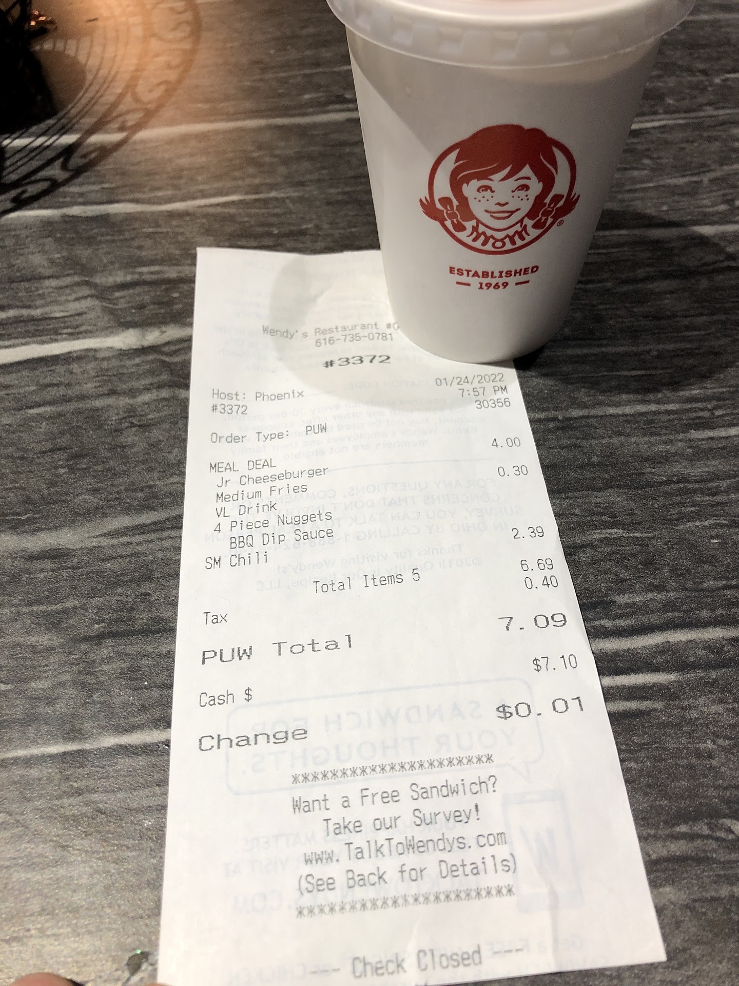 Read moreThe cashier patiently waited for us to give our order as we sat and pondered the menu, and even handled our difficult, coupon riddled order very well and very professionally. However, that's where the good news stops. We sat down to eat, and realized that everything was cold. We had a bowl of chili - cold, a side of chili fries - cold, 2 small fries - cold, a single cheeseburger - cold, a spicy chicken sandwich - cold, a cheesy cheddar burger - cold, and a crispy chicken sandwich - actually not bad. As the sandwiches still contained good flavor and were more lukewarm than stone cold, we did not complain about them. However, fries, chili, and cheese that is suppose to melt, could not go unnoticed. Back up to the counter they went. The girl was again nice and super professional. We asked simply that they nuked them so as not to waste time or food. However, they were gracious enough to completely replace the food. Happy to be sitting down again with the feast in front of us, we dig in, only to find that the replacements were just as cold. Back up to the counter we went, again. Finally, we got nuked food, steaming hot out of the microwave. But by then, our already cooled food was stone cold and all flavor was completely gone. It was a complete waste of money, and a complete...