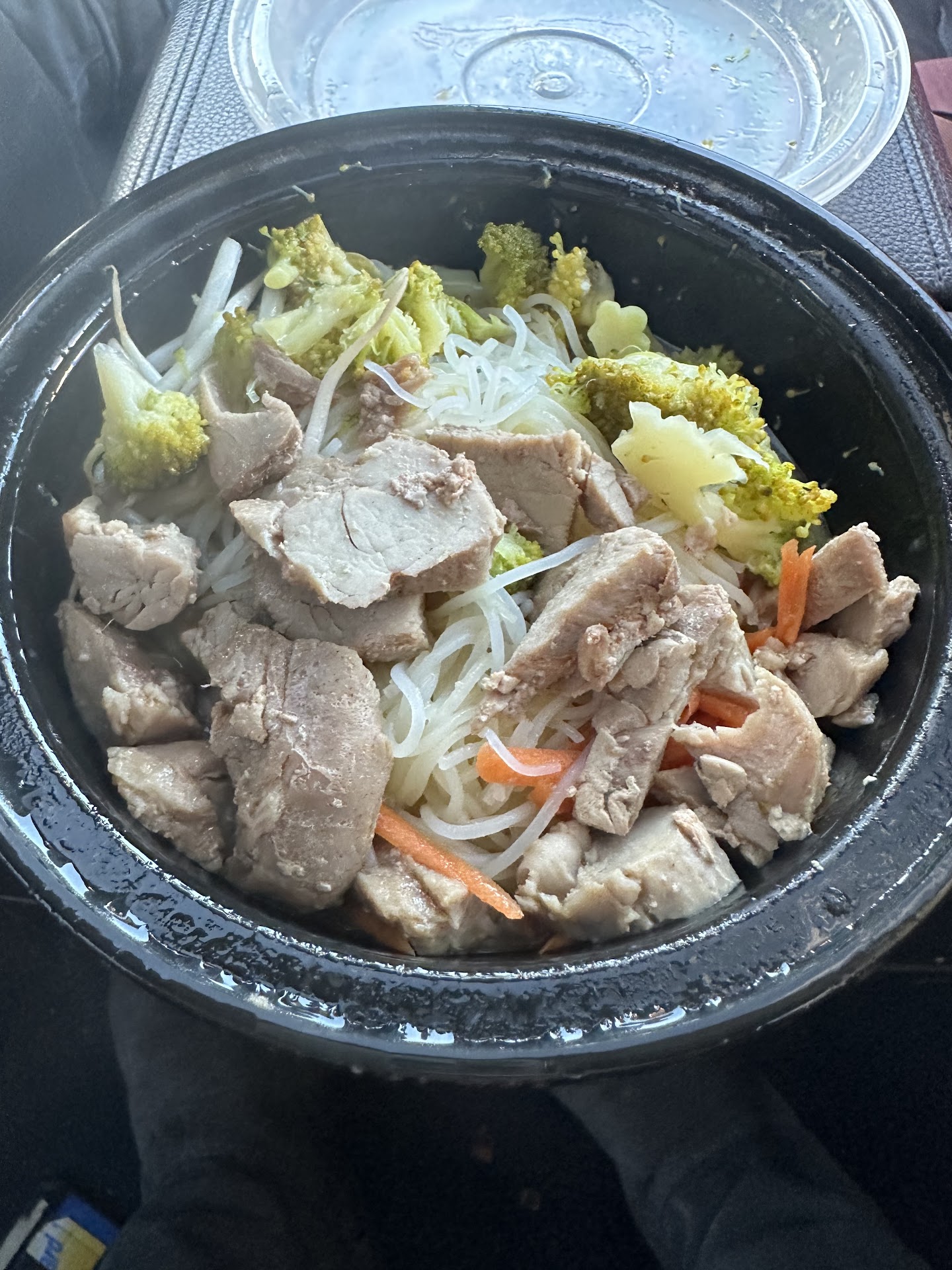 The meal was thoroughly disgusting. Large chunks of slimy, stinky pork, that made me feel very uneasy were in my bowl, however because I was in a hurry and coming from intense physical activity, I took a few bites and when I realized the meat is off, I ate all the vegetables around it.