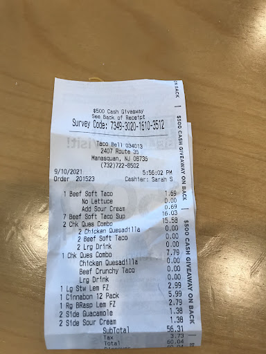 Read moreIâm sad to say this is a Taco Bell we like to stop by for our cravings; but tonight was a shitty experience my grilled cheese burrito the cheese was fully stuck to the wrapper. The cashier argued with us over a 20 dollar bill because it had a 2 millimeter tear on the perimeter. He asked us to tape it and said he could not take it. The bill wasnât torn even a 1/4 of in inch. No one carries tape in their car as a common rule. The bill would still be recognized by the bank as an appropriate circulating bill. Out of the two items the burrito was soggy on the top from the cheese not having enough time on the grill and the Gordita barely had any ranch. He took the bill at the end shaking his head. The moral of the story is you need to have backup payment to order at this taco...