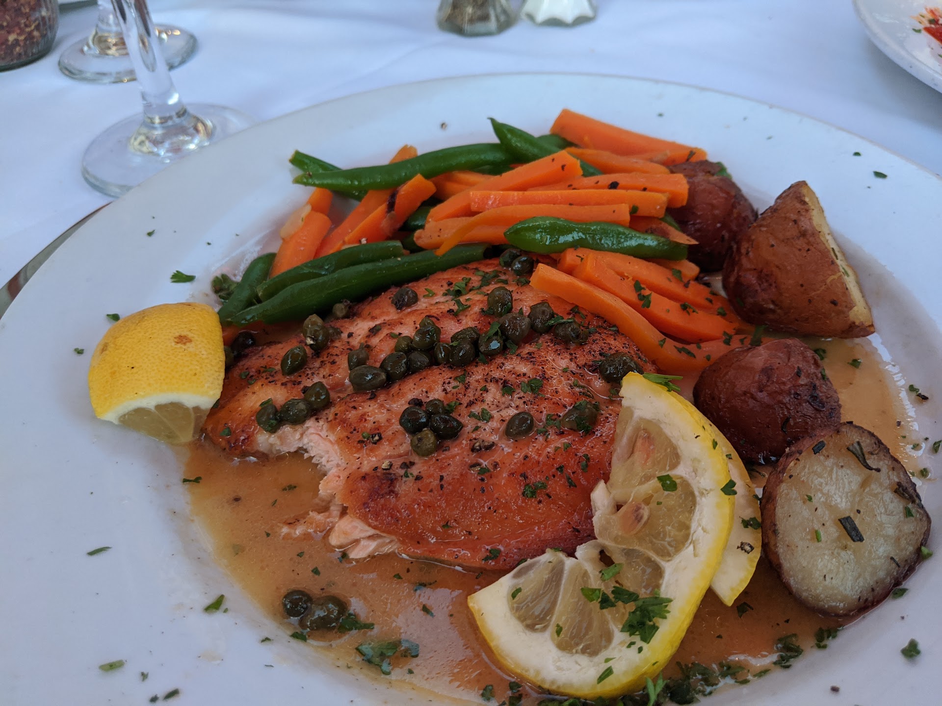 My husband and I had dinner here for the first time this evening. He had a double-cut pork chop, which he said came out exactly as he ordered it "medium rare" and he loved it . . . high praise, indeed, as he is in the meat business and knows a good cut and quality when he tastes it! I had salmon piccata, which I thoroughly enjoyed. The salmon was cooked perfectly and served with just the right amount of piccata sauce, of which the taste was light and balanced.