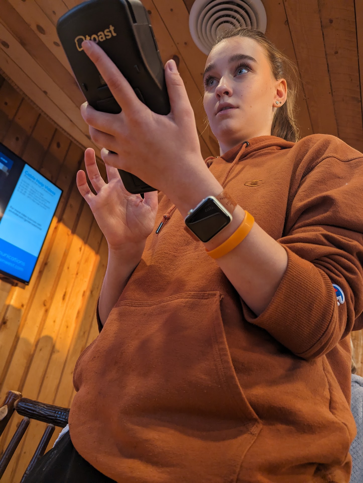When we arrived around 12:30P there was a line. The restaurant was very busy but the staff kept the line moving and we were seated in a reasonable time. It took a while for our server to show up but he was busy with several tables in his area that were seated before us. My wife chose the Heifer Salad with chicken which she said was delicious and helped it along with a huckleberry margarita which she said was also delicious and big enough for two people! Salty Steer gets an A+ rating from her.
