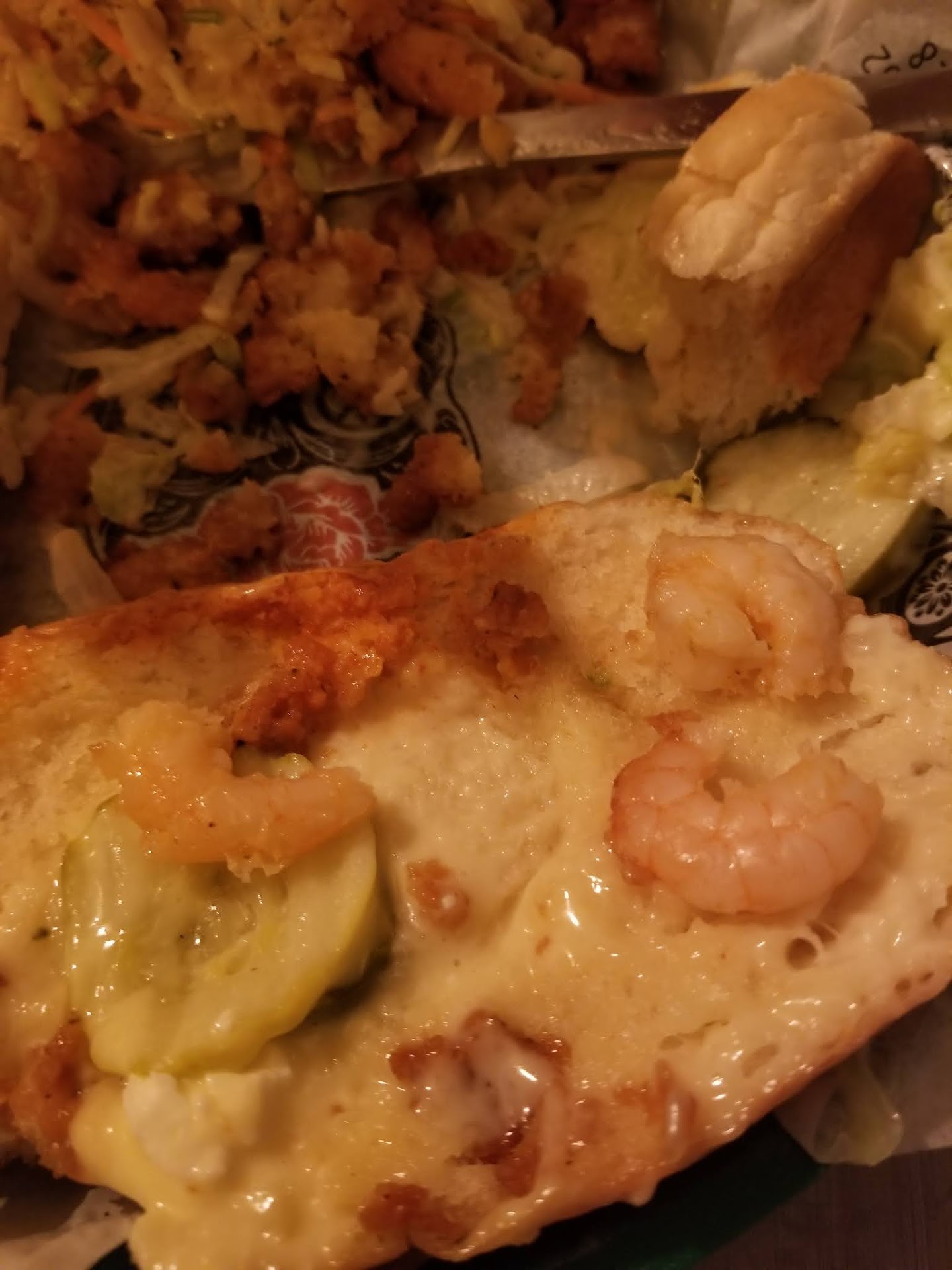 The margaritas were okay, I had a hard time finding the booze, but the chilled sweetness was a welcome reprieve from the indoor heat. Dinner time. We ordered a shrimp poboy and the bread came to the table hard as a rock. Not a slight crunch, a rock hard baguette that could have hammered a nail. We had the waiter tap on the bread to which they were shocked and said that wasn't right. The remade poboy came back on the fly and it was almost as if the kitchen was punking us. They didn't toast the bread, nothing. It was a soggy mess. You picked up the sandwich and it just flopped over. After inspecting the overly battered shrimp, we realized they were either Oregon pink shrimp or small shrimp which were too small for frying. So you ended up with just bites of breading, not shrimp. I have included a picture so you can see the size of the shrimp (after taking off the breading.) This was the worst poboy I've ever had, by a country mile, and New Orleans would be ashamed. They did remove the poboy from the bill (the waiter was the sole highlight of the visit.)