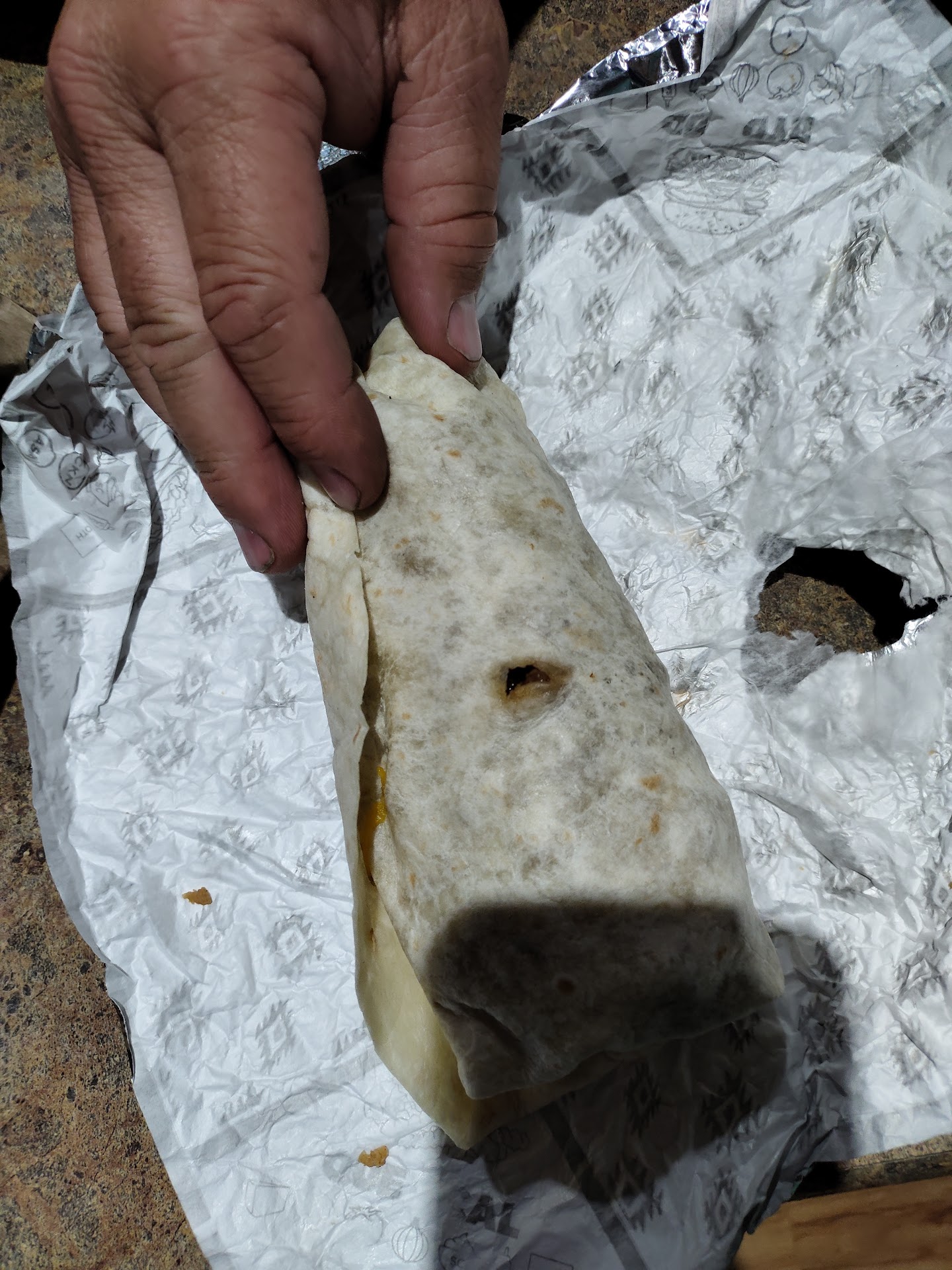We checked our food to make sure we had everything, and we didn't have our quesadilla and when we opened the burrito package we saw a hole in the burrito and in the wrapping, which was concerning.