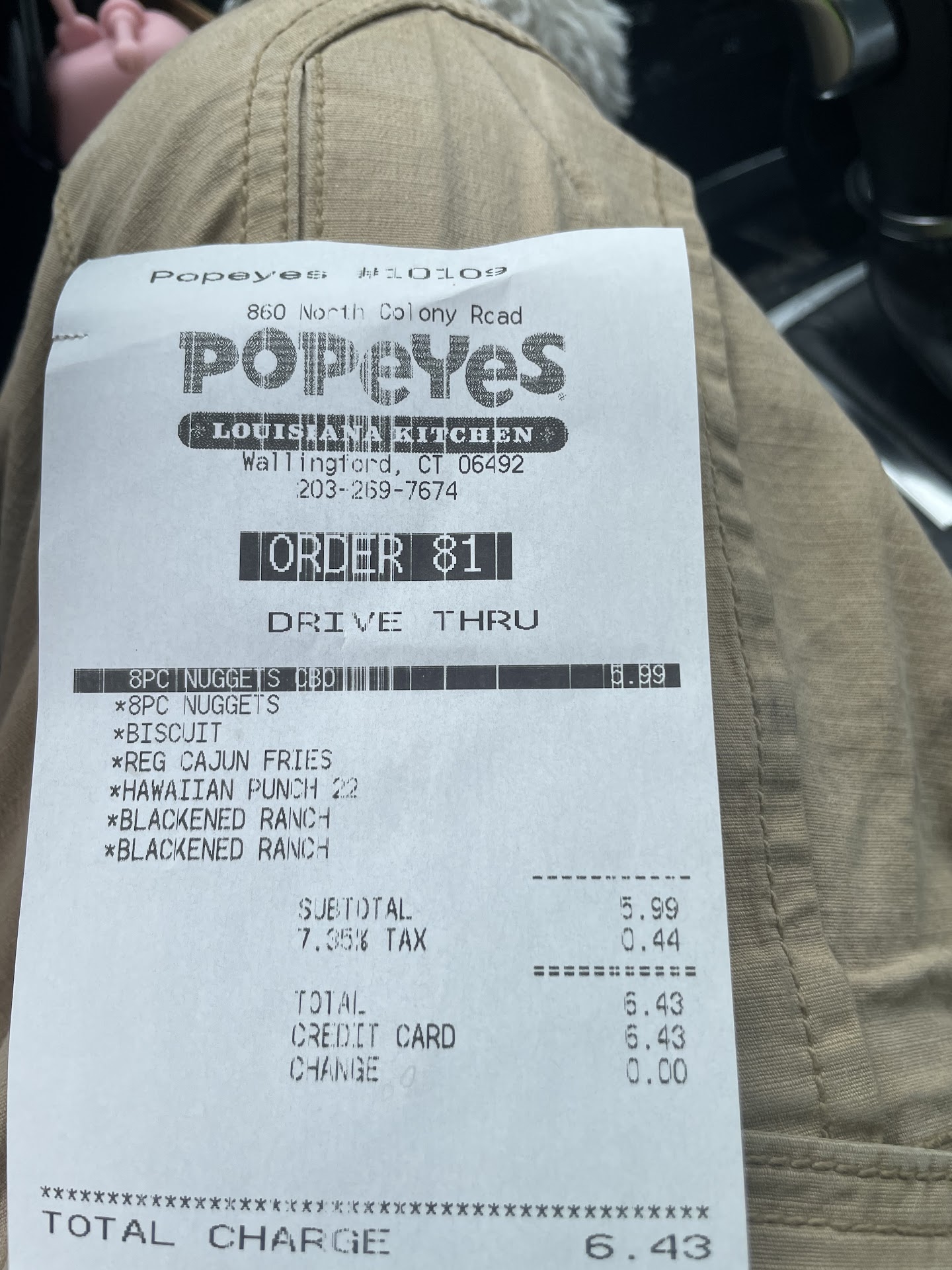 Read moreHonestly I was hoping I wouldnt have to come to do a terrible review on Wallingford's popeyes, but here we are. There service is absolutely atrocious and the food tasted old as if it was sitting there for a week straight. I was asked if I actually liked the chicken at popeyes like if I was being judged based on my appearance. Afterwards they forgot 2 things off my order and when I went back, I kindly said "I think you forgot something in my order". Which the drive through lady working the night shift at 6:00PM (11/2/25) thought it was appropriate to responded back with "do you think or do you know" and when I replied "I know" she responded back in a very rude and unprofessional way that made me feel uncomfortable "next time you should say I know instead of I think" which took me by surprise because I've shown nothing but kindness. I felt like she stereotyped based on my appearance and that she considered me illiterate because she wanted me to tell her "I know you forgot stuff in my order" which to me makes no sense, when I was just trying to be kind to her. She then smirked at my face and proceeded to roll her eyes and slam the window infront of my face. I wouldnt recommend coming this popeyes at all especially when reading the other reviews about poor management and poor customer service and nothing changing at all about it save your money and your time and go somewhere else. I wish they would...