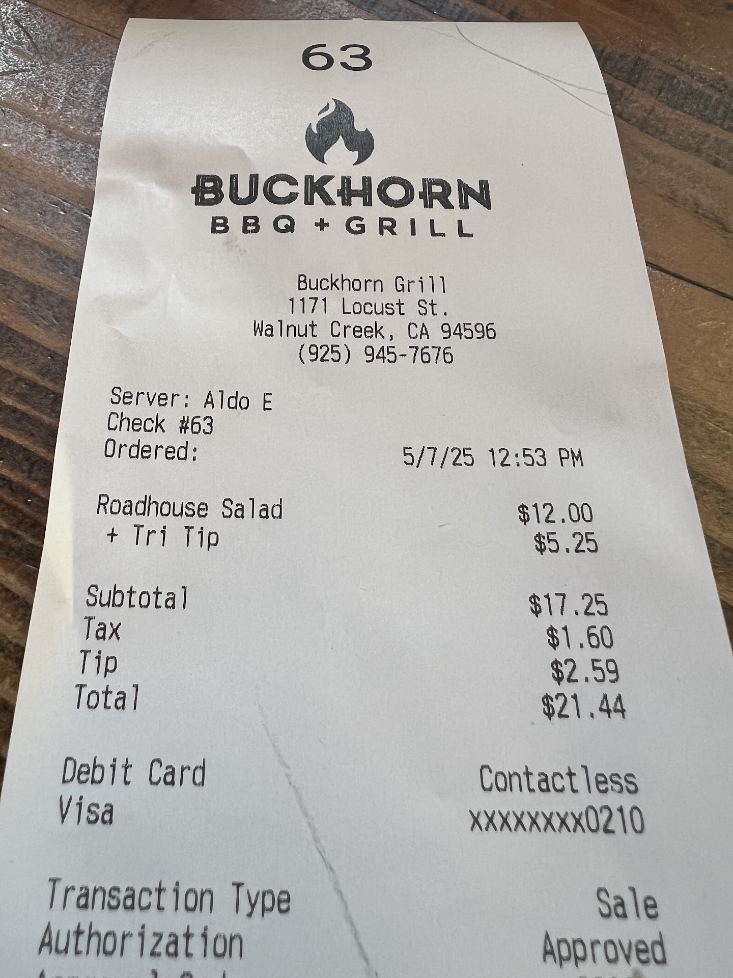 Ā Ā Ā Read moreI love the tritip salads at Buckhorn. The service and the food presentation here is normally good. This was our first time we were at this Buckhorn since Covid. We were the first ones in the door.