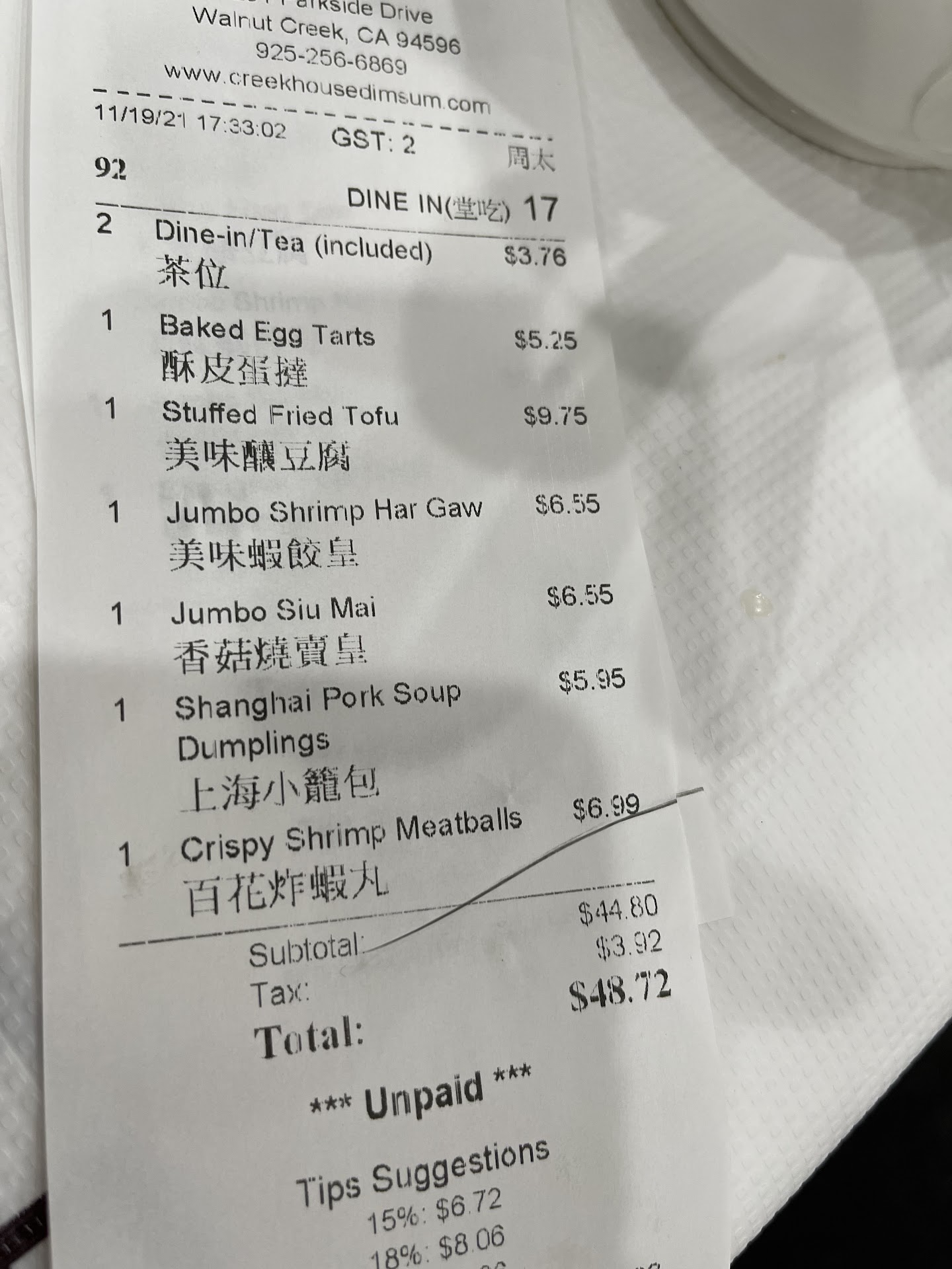 I have read other reviews about this establishment and wanted to try for some time. I grew up on Dim Sum in San Francisco on Clement Street but always wanted to give other areas a chance. My reasons for a 3 Star ā which is good! The true Dim Sum experience is with carts of food coming out of the kitchen rolling up to your table with the names of the dishes called out. At Creek House Dim Sum you do not get this experience because there is no room for carts. Ambience: The place is clean, well-lit and furnishings kept up. Located in a small shopping strip mall there seems to be plenty of parking. They have an electronic sign-in at the front where you leave your name and cell number and you get a text when your table is ready. No reservations. Bathrooms seem decent (they are not storing restaurant furniture and supplies in the womenās room- LOL!) Ordering: You mark up a double-sided piece of paper with the quantity of orders you would like of each dish. There are no full ingredient descriptions like a menu. If you have never been to Dim Sum this could be tough, I recommend you go with someone that knows the dishes. Optionally you can scan the QR code with your phone and view the menu. There is a pretty extensive selection of your traditional Dim Sum and other lunch time noodles and side dishes. Dim Sum small plate prices range anywhere from $5.25 to $13.50 while the large lunch plates go anywhere from $12.50-$22.25. The wait staff comes by your table and picks up your order then prints out onto a smaller tab then tapes it to your table. As each dish comes out one by one, at any time, the server will cross out the item(s) they have brought to your table. Be patient and make sure you are prepared to eat leisurely! We arrived when the restaurant opened on a Sunday ā 10:00 AM. Our first dish came out around 10:30 AM and our second dish came out maybe 15 minutes later. The restaurant was full by 10:30 AM but we noticed that patrons that came before us had nothing on their tables either. I am somewhat surprised because every time Iāve gone to Dim Sum in the City its fast and furious when those carts are coming out and dishes start to pile on your table. They want you in and out and your table turned over fast! Not here, its very leisure. The food was delicious! Please note that if you are sensitive to MSG, like I am, the food does contain some MSG ā notably the fried items. They do offer tea at $3.50 per small pot, no refills. We will come back and try dinner here and I will provide an...