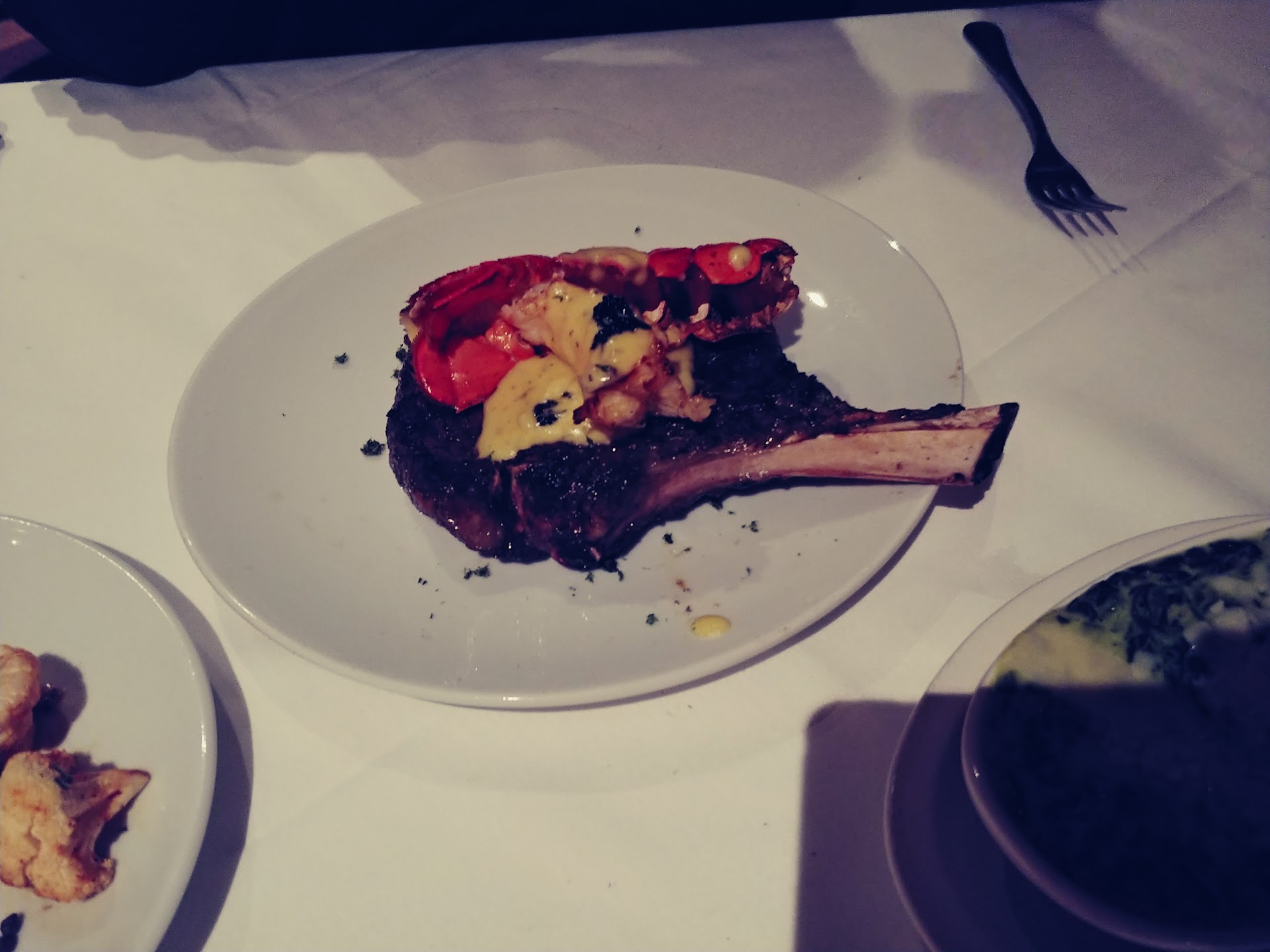 This last Sunday night me and my partner decided to go for dinner to this location. Sort of our date night it's hard to get out without the kids so we wanted to go somewhere and get a steak. For appetizers we got the jumbo prawns and mushroom soup, main courses we both got the bone in USDA prime ribeye topped with lobster tail, side of charred cauliflower and creamed spinach. Lastly for dessert got the lava cake and a key lime pie which we shared.