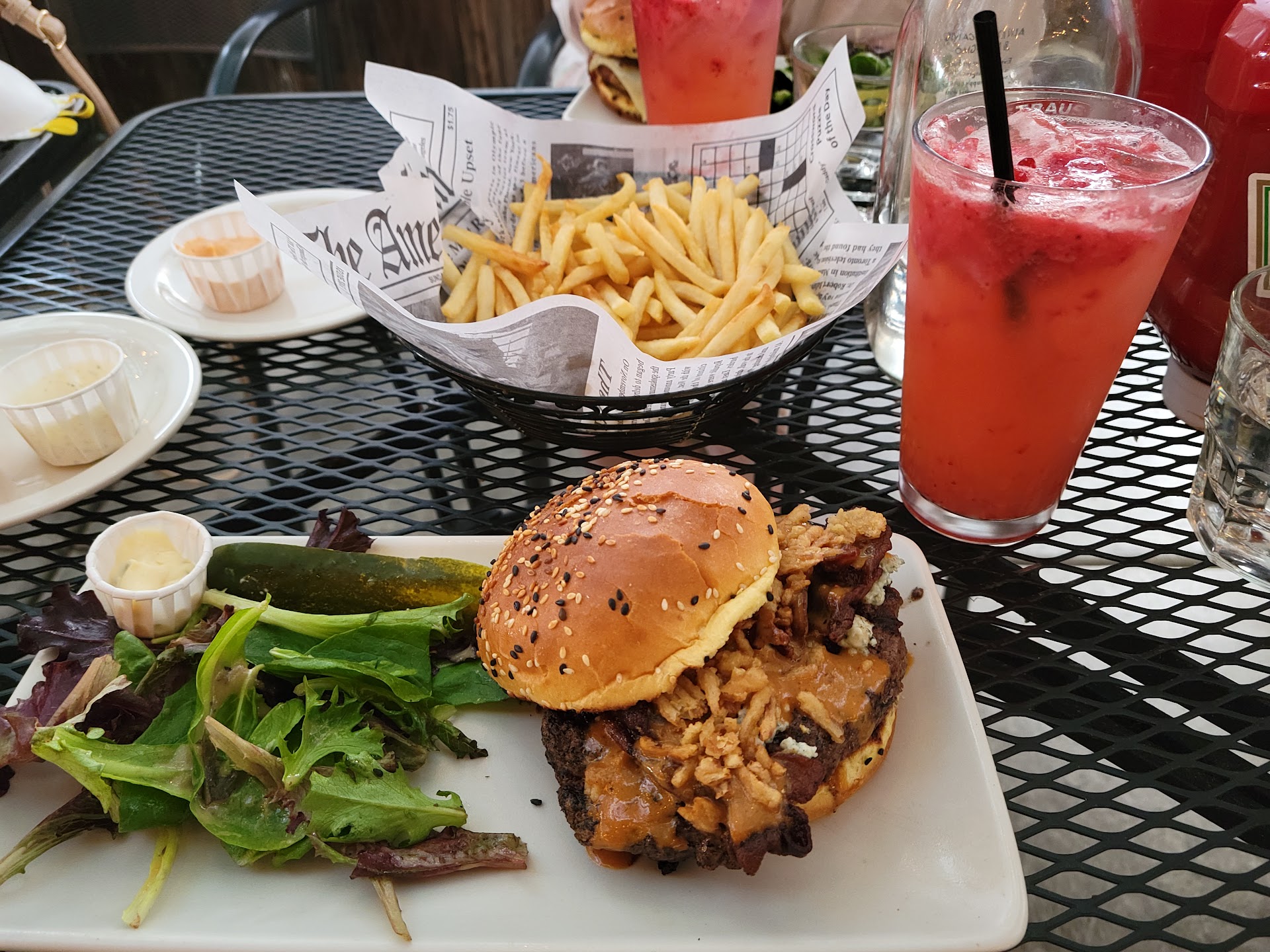 Ordered the drunken burger this time. Burgers come with greens when dining in not fries so you need to order those separately. Ordered large fries to split with my fiancée and ordered a strawberry lemonade to drink.