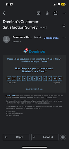 Read moreI just ordered a pizza I waited an hour and 25 minutes it arrived cold I called the store to let them know that my pizza is almost unedible she told me that well there's nothing we can do about it you paid for it you got it because we are short staff you just have to accept it this was the worst case of bad service I asked for a manager he was outside and did not want to come to the phone save your money this piece of location is 2 miles away from me to say your short staff is understandable to treat customers horribly is not I will never order from them again and I would suggest anybody else avoid the heartache and misery of such bad service I hope the manager outside has time to read this former loyal Domino's...