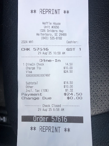 My spouse and I made a dinner stop here on our journey towards home from Florida. This was a random pit stop, and we're so glad we found this place. This Waffle House is the best location I've ever been to. The staff are the true gems of this restaurant. Ashley. C and April were such great servers. They are well mannered and very friendly. Alex was running the show at the grill, cooking single-handedly for an entire restaurant full of people. He was impressive to watch coordinating so many meals at once. Even being so busy, he'd check in with patrons behind him to see if everything was okay with their meals. I haven't seen this true, efficient, polite wholesome American service in years. They're genuinely pleasant, and it's so refreshing to see these team members working in sync with each other and happy while doing their jobs. We enjoyed our meals a lot. I ate the chicken hash brown bowl with onions, and my spouse had the bacon patty melt. Both meals were well portioned and reasonably priced. If we ever come back through this area, we'll...