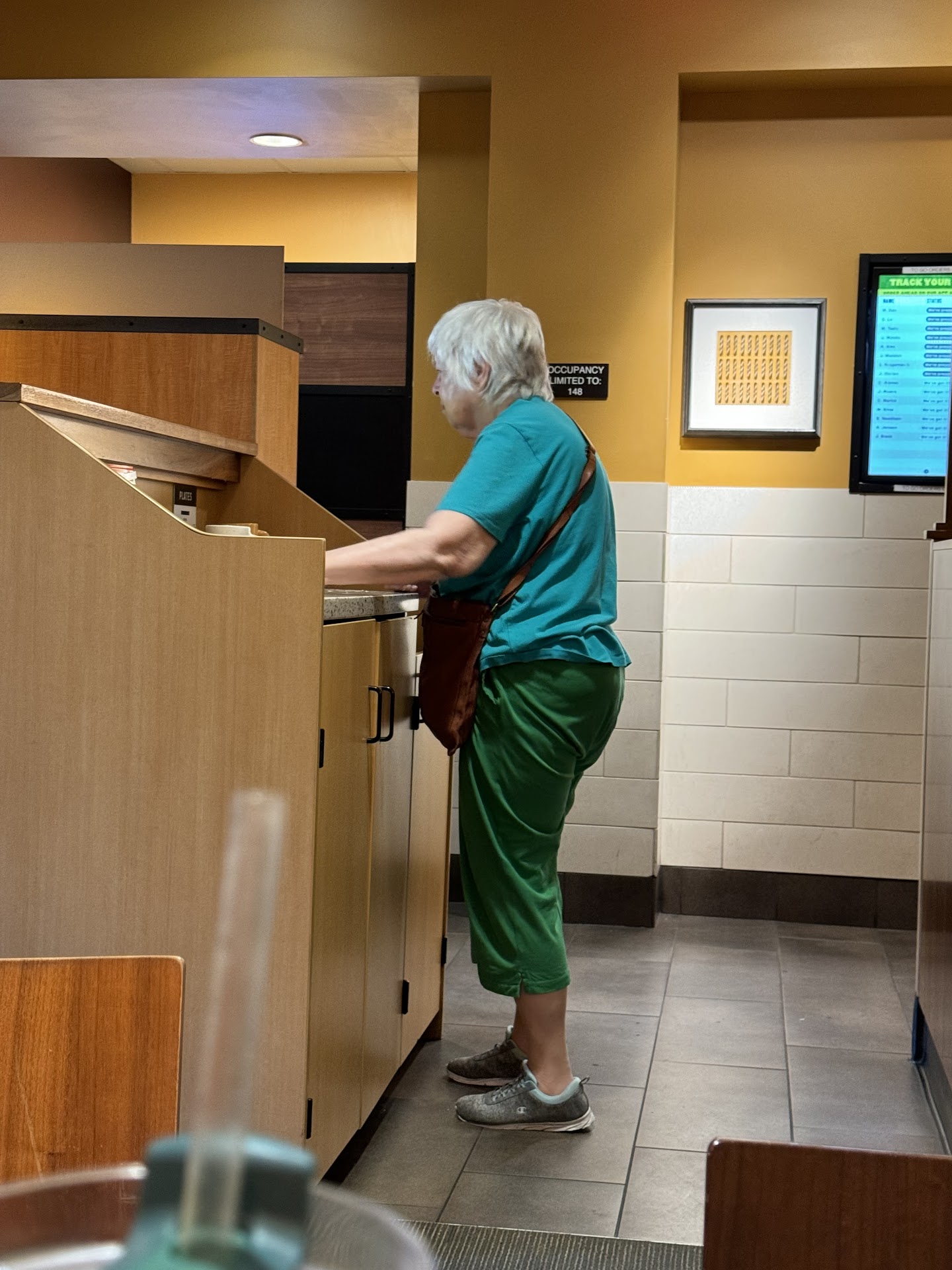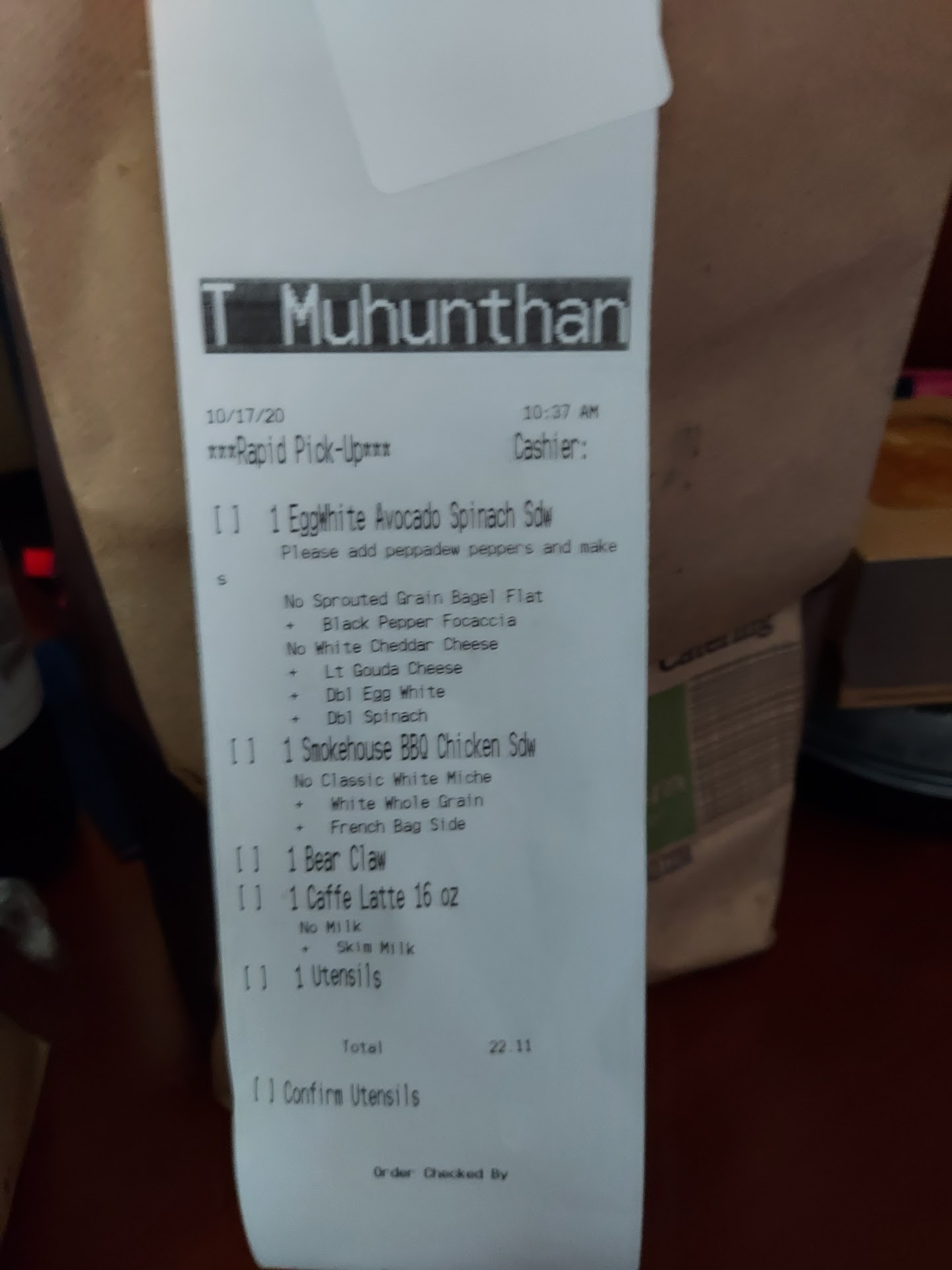 We then sat down and waited for our food. I noticed that this Panera actually had food runners, which is interesting considering most just have you wait for your name to be called and then you walk up to get your food. We waited 20+ minutes for the server, who I witnessed laying her head down near food, tapping soup bowls with non-gloved hands, and failing to stop touching her face and then plates, deliver our meals. They forgot my fiancee's side of chips and her coffee. Our soup is luke warm, and after 10 minutes or so, they bring out her coffee. It is chunky. How do you make coffee chunky?