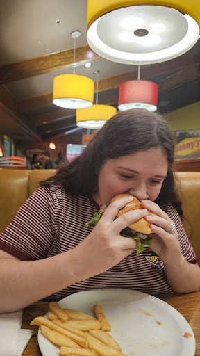 Read moreI just visited with my partner for the first time, and I believe that we couldn't have experienced a more perfect introduction to Denny's. For context, we came in like 8-9 PM on a Sunday night. It's very quiet and relaxing, and it's small, but I like that a lot. Our server, Krystal (I apologise if that's spelled incorrectly), is such a sweet person. She's very kind and she was on top of making sure that everything's good with our dining experience. Definitely an example of what customer service should be, but also an example of how treating others with kindness goes a long way. Now, to the food. The menu is HUGE, which can be overwhelming, but there's so many good options. It's very affordable to dine at Denny's, about $10 - $20 per meal depending on what you get. We placed an order for the cinnamon sugar puppies, and it's an amazing deal. 10 big hush puppies for $5, I'd happily get those every time. Now, I saw the Beetlejuicy burger that they have in promotion for the movie releasing, and I knew that I had to try it even if it gave me the worst heart burn that I could imagine. It tastes great. Yes the bottom bun gets super soggy and it's a burger that you'd definitely need a fork and knife for. But as long as it tastes good, that's what matters to me. I am experiencing heart burn after, so maybe prepare for that, but it's worth it to be super filled. I like that the fries come out unsalted so you can add however much you want to them, it's nice because a lot of places will make them super salty. They're good, fresh and on the softer side, which I'm sure you could request them crispy if you wanted. My partner got a spicy skillet thing, and he really enjoyed it. He added an egg for only $1 and he says that it's worth it. The chorizo was good, chicken was excellent. Very juicy and tender. Potatoes were thoroughly cooked and well seasoned. Overall, we loved coming here and we definitely plan to visit again to...