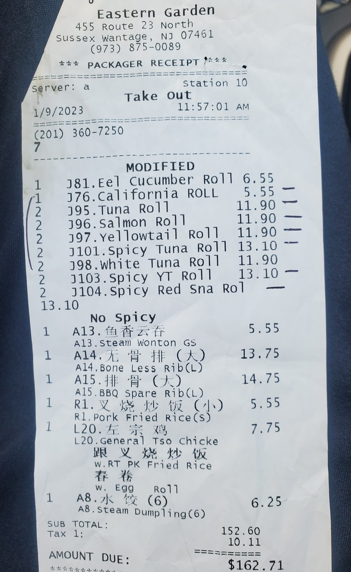 There was a lot of hair in my sushi. Obviously put there purposefully because I found at least one long silver hair in each and every roll. Luckily I caught the first one before I ate it. Look, in a college student and am used to being at least somewhat discriminated against when eating out for not fitting the silent dress code. Simply put, I look like a college student and this is the only reason I can imagine these chefs chose to single my friend and I out. We ate at the restaurant then got extra sushi to go. We had a $60 check between the two of us and left a %20 tip. We weren’t dressed awful, but I had a hat and my friend was wearing a bandana on his head and they must have wanted to send the message that kids like us shouldn’t come to sit down and eat. Or the chefs ignorantly believe that violating health and safety regulations is funny. I know we were singled out because this restaurant is generally great and gets great reviews because of it. Until today it was my favorite place in New Jersey to get sushi, for spicy tuna specifically. I wish I could go back and take my hat off and present myself better because I can no longer eat at Eastern Garden in all good conscious. I wish I could say the place is bad overall, but it isn't. They offer excellent food at affordable prices. However if the staff treated me this way there are undoubtedly other cases that either went noticed or unnoticed and that to me, is sad. I hope someone there sees this and realizes that this is not a proper way to conduct business. They hold everything they need to continuously prosper for a long time to come. Instances like this however put chips in the armor and slowly destroy any establishment. I study business and expect little to impact on then from my experience. All I can do is...
