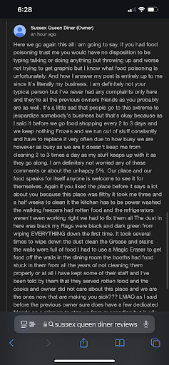 I feel like Iam walking into my Mom & Dads dining room for Sunday dinner. Where you can not only eat. But spend time with your family members enjoying a delicious meal talking laughing in a great atmosphere. Sussex Queen is out there doing what they do their very best, Making great affordable meals for...
