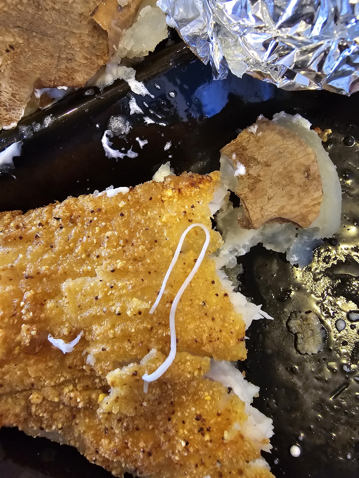 I watched as they kept taking and handing out drive-thru orders, but nothing for the dining room. They started making my food and bagging it in parts. They made the hush puppies and fries first, bagged them, and allowed them to sit — with no heat — in a bag for 20 minutes before bagging my chicken and fish.
