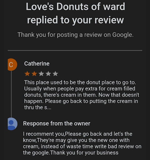 Read moreMan I felt bad giving a bad review cause I know mistakes happen but literally the top review is someone saying they didn’t get cream in their cream-filled donut. I got this one with maybe a nickel sized amount of cream in it. And no I’m not gonna load my two kids back up in the car and drive from the town over to ask for a new one. Clearly yall know this is an issue. Tired of paying customers being told that they should have done something differently just to get the food they asked and paid for. Your response to the last comment about this issue shows a real poor customer...