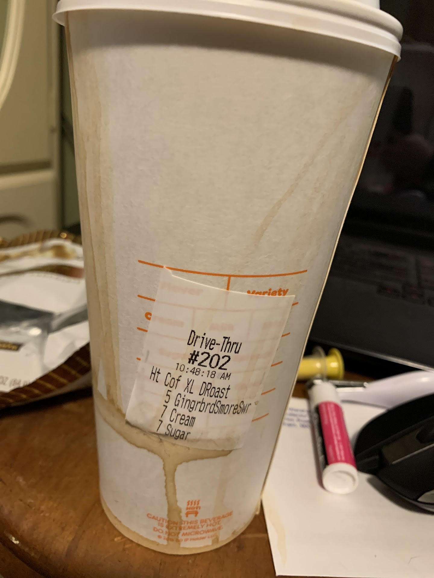 Read moreI go to this Dunkin because it's closest to my house. I order on the app for walk-in pickup (because the drive thru line is always crazy here) to save myself time, but without fail, there's always some issue. Often, I place my order on the app 15-20 minutes ahead and it's STILL not ready when I arrive. On other occasions my order has just been completely wrong. I usually let this stuff slide because hey, it's food service, it's Dunkin, it's a pandemic and we're all trying our best, but after a while enough is enough. Today I ordered a coffee, a bagel untoasted with cream cheese on the side, and a donut for my kid. What I got: a coffee, a toasted bagel with no cream cheese, and no donut.