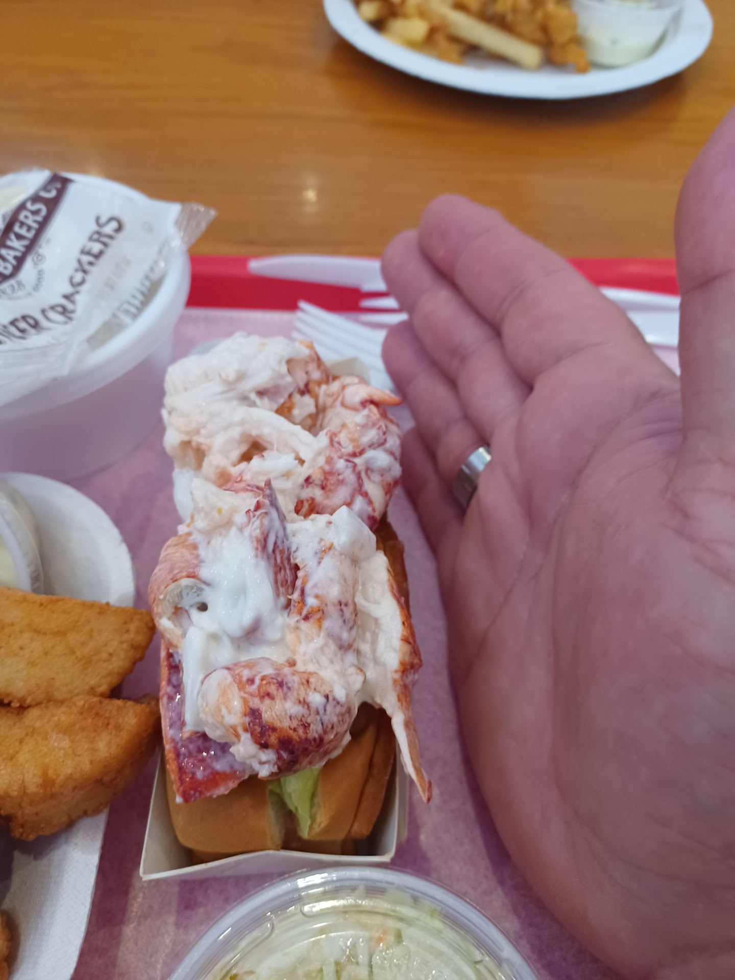 The food was all tasty, but it wasn't stop the train tasty. The lobster roll was $31 by itself. It doesn't even come with a side. I had to order a tablespoon of coleslaw on the side for extra. For $31 I was expecting an 8-10" hoagie roll full of the most tantalizing meat I've ever sunk my teeth into. Instead, I got a puny hot dog bun with a small heap of some rather bland tasting lobster. The whole roll was smaller than my hand (see pic), and I have small hands. $31??? Did they see my license plate and just play a cruel joke on me??