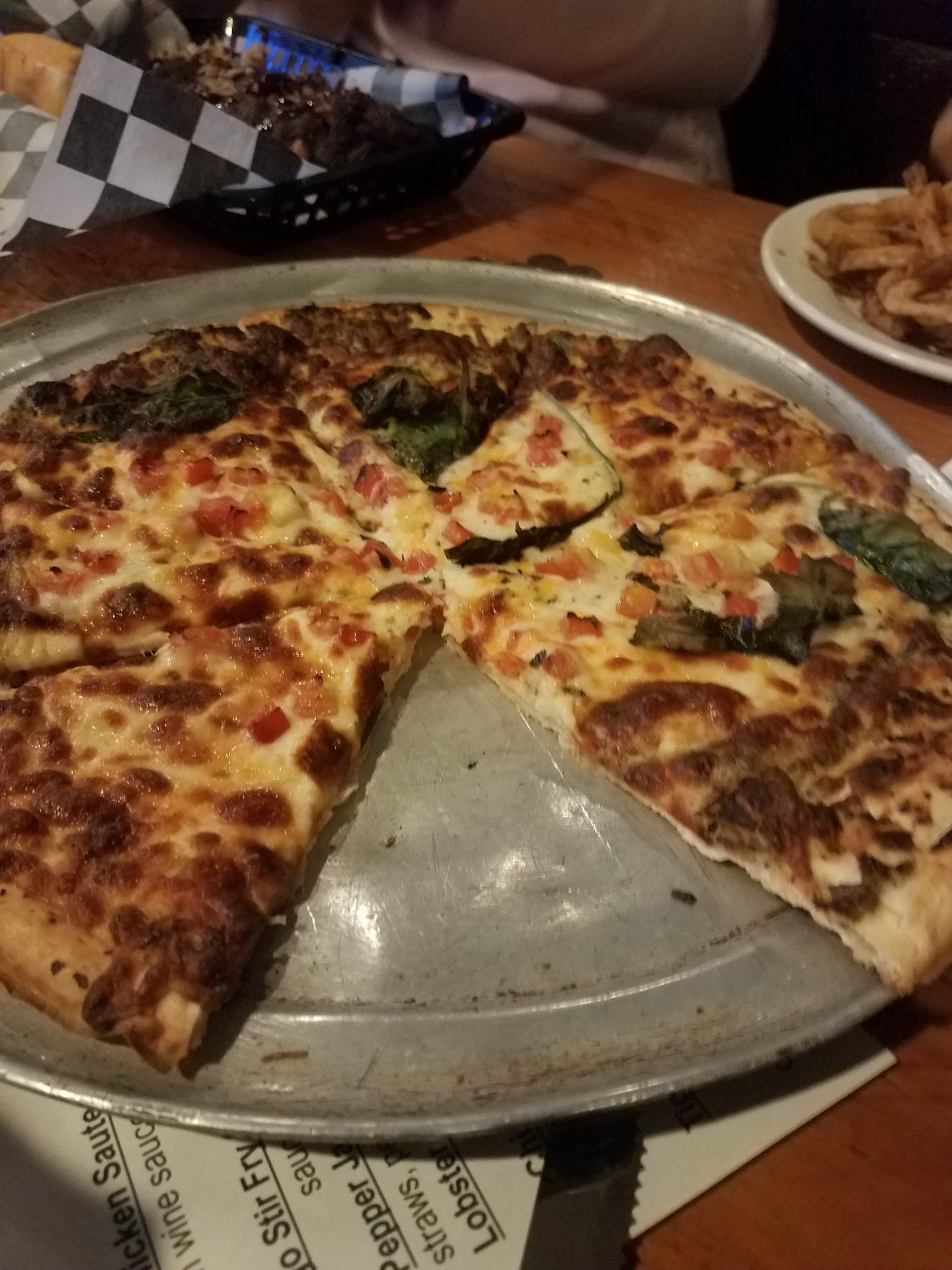 I ordered JUMBO fried wings. They were your standard to smaller party-size wings, but a good serving size. The bruschetta pizza was overcooked, burnt in many areas, EXTREMELY dry and tough to chew. Not impressed. In addition, the chicken wings and fish-n-chips were over fried and dry as well. It's really a shame because the parmesan garlic sauce for the wings was quite flavorful and complimented the wings so well.