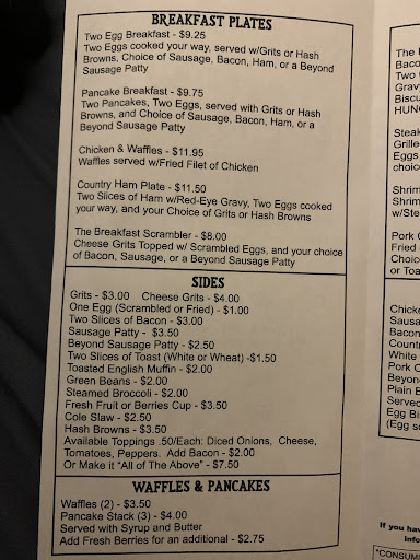 Read moreThis is such an adorable place with soooo much potential, I honestly believe with some new management who will properly train their staff on how to properly cook the food and the waitress staff how it's very important to communicate with your customers and when they're not busy to keep your customers Coffee, Tea etc. flowing. Our waitress was precious, but not properly trained, she refilled our coffee once. One of us ordered the Country Ham breakfast because it came with Red Eye gravy, we were so excited about the red eye gravy. Plate was brought out without the red eye gravy and were told it was cooking, ask about the gravy 15 minutes later and was told the cook was very busy, with only 6 other customers in restaurant, waitress would never even look at us after that. Never did get the red eye gravy, which was the whole reason for ordering the Country Ham breakfast. I later had to flag waitress down to ask for glass of water, as I was completely out of coffee and was about to choke on Biscuit. My Sister had to ask a girl cleaning tables for me some water. We ask her to please tell our waitress we needed a to go box and our check. That sweet girl brought us a to go box and water and we gave her $5.00 for bringing water and to go box. About 10 minutes later our waitress finally brought check. I so wished I lived here, because I would love to just go in and properly train the staff and make this place so successful. I grew up in a hometown restaurant business from my grandmother then onto my Mother. Always smile, be friendly and take care of your customers. That's where your paycheck comes from. Best of luck to this adorable place. P.S. The Coffee and Delano Omelet were great. The atmosphere was a little odd and I think it was because the waitresses were probably catching flack from customers about their food. From the reviews I've read, after I left mine, it seems like so many people are rooting for this place to succeed, they're just wanting better service and food. Teach your staff to be curtious and...