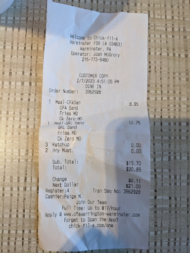 Read moreNew location at Street Rd and Jacksonville. Interior is beautiful but we sat outside to enjoy the weather. Ordering was fast and easy and our food was brought to us at our table outside. I've never had food at a Chick-fil-A that wasn't good and this was no exception. I'm obsessed with the summer drink they're serving - watermelon mint lemonade. So delicious! As we were leaving, hubby was putting our trash away and I was waiting at the table. We had some food we were taking home and a server came outside and asked if I wanted a bag! Wow. Then, when she brought the bag noticed our drinks were empty and asked if we needed refills. Double wow. Unfortunately they can't refill the watermelon mint so I got regular lemonade which is also good. She went inside and got our drink refills. I believe her name was Kaila so thank you Kaila for such unexpected exceptional service. Nice restaurant, good food and great service. Very impressive for a fast...