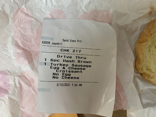 Ā Ā Ā Read moreThis is my 2nd time going to this particular Dunkinā Donuts. The first time I ordered a hot chocolate, it was very watered down. I didnāt complain, I figured well they had just opened at that point. I will give them another chance. Today I stop by for food no beverages. I ordered hash browns and a turkey sausage on croissant (no egg, no cheese). I know when I order this I am still charged full price for the sandwich. I donāt mind that. (Most of the other DDs I go to when I order this will just give me 2 patties instead of 1). Anyways, I got just a croissant, no meat. Just a croissant. Thatās no what I paid for. I usually check my food before pulling off. I peeked in the wrapping and saw a croissant so I assumed I was good. Got to work and I was...