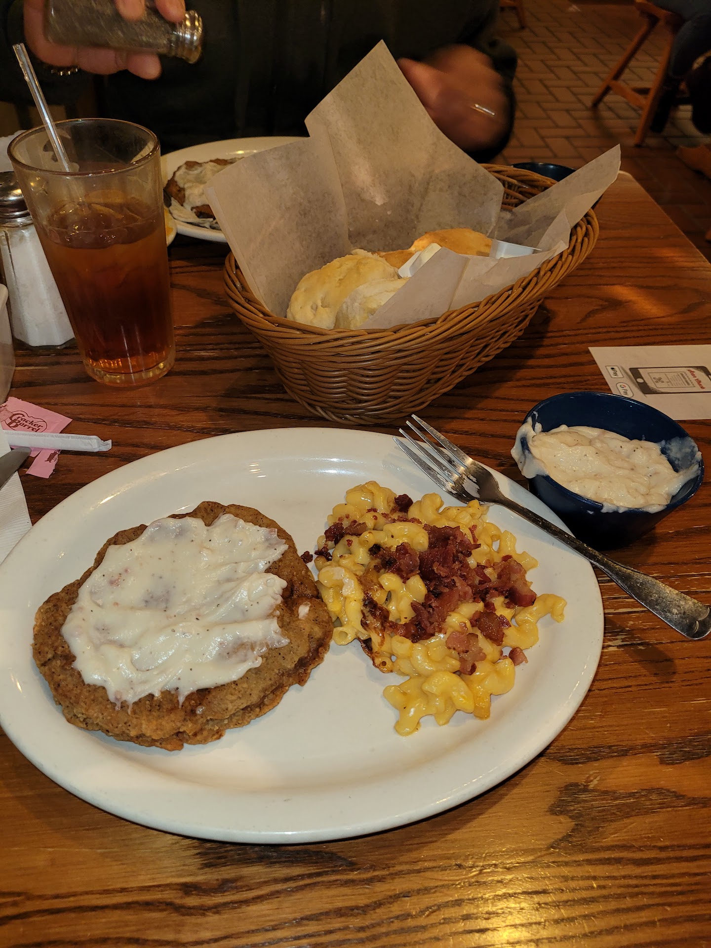 Read moreDisappointed in the service, the Togo order food, and overall experience. The store atmosphere is a 5, but the atmosphere around getting my order correctly, was skunkie! I ordered pickup 30 minutes before I got there. When I called to say I was there, the young man on the phone said I'd have to come in. I wasn't dressed to go in and had been outside a good while working. We live nearly an hour away so it wasn't like I could run shower and come back. I explained, I felt he didn't seem to care at all. Initially, when they brought our order out, I was confused as to why the strapping young man only brought half the order with him. He said it's all there. No! I was missing a complete dinner, two extra sides, a large tea, and an order of bread. Additionally, the guy, new to Cracker Barrel, argued with me when I told him my order of bread wasn't there. He said yes it is and pulled out the bread that goes with the two meals they did have right. Now, as I'm typing this, I realize they shorted me two additional breads that we should have had with the meal they'd forgotten. $8 extra muffins and biscuits I ordered; 5 of each were the ones missing, and I finally got them because the female manager went to get them boxed herself. Lastly, I felt the manager was making sure I did have all I ordered, but as I stood to go (it was taking so long, I had to go sit down in the dinning room. It was easier anyway to figure out what I was missing.) she turned around and asked, Do you want dessert or something to make you happy. I almost cried and or lashed out, it seemed condescending to me, but I smiled with all the sweetness I had left and said, No Ma'am thank you, were trying to not eat much sugar. Then I happened to think my husband had said he wanted pecan pie so I followed after her a couple of steps telling her, Ma'am if you have pecan pie I'll take you up on that. They didn't, it's only seasonal at Thanksgiving and Christmas I guess. The chicken tenders were the biggest disappointment. We've eaten at Dublin, GA's CB 5 or 6 times recently and their fried tenders look and taste great; like your Southern Grandma soaked them in buttermilk and floured them perfectly. Watson were flat and pretty much flavorless. By the time I finally walked in the house I knew they would be cold. They were so hard already I didn't dare heat them. Husbands shrimp were less than par by now to. Last thing, I asked for my generous tip back, since I had to come in and get food and no one actually served me; I do appreciate the cooks, but let's be frank, they'd of never seen it, and I was told the young man didn't know how to refund, neither did the female manager, nor did the male manager she went and asked. They said no one had ever ask for their tip back. People don't reward bad service, at least I don't. I do; however, generously tip those that go the extra mile to make my dining experience a pleasure. This ranks as one of the top two worst meals and experiences I've had at CB. BTW my cousin takes her dad to this very CB weekly and they usually have a nice breakfast. May be that I should stick to...