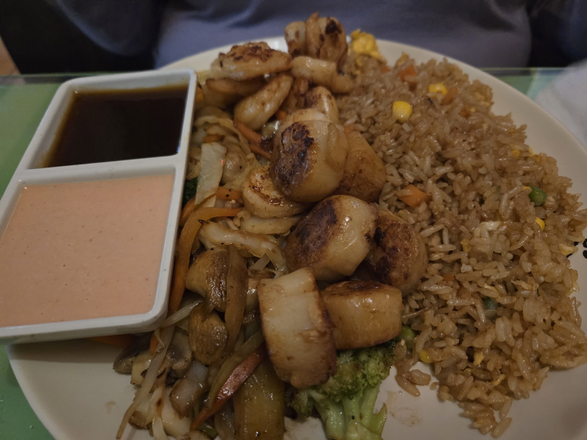 We both ordered hibachi dinners; salmon, shrimp and scallops, which include soup and small salad. Everything arrived in a reasonable time. The only thing off was that the rice was a bit firm, but other than that, it was good. The prices are fair and the portions large, thanks to a lot of...