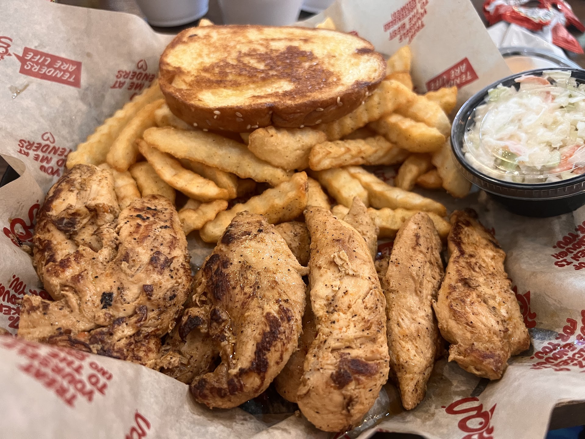 I was wondering if the resurant was similar to Zaxbys, and it is with the bread, crinkle fries and tenders. That is where I will end the comparison. I hope they are able to keep this quality of food up, because I never really associated chicken tenders until I have had these tenders. Tender is not just a cut of the chicken, it is how you want it to be, and it was tender. I will call it the tender, tenders! I also had a lemonade and they were not stingy on the lemons. My tenders were sweet heat, delicious and garlic parm, which was good also according to my daughter. The meal also came with slaw, and I liked it. Lastly, I wanted ranch and honey mustard sauces, but I had to pay .89 for those each. I don't like zax sauce and I don't like magoo sauce, they taste the same. So, I pay for a sauce I don't like and have to pay for a sauce I do like🙄 Other than that 5 stars would have been awarded. Overall, Keep up...