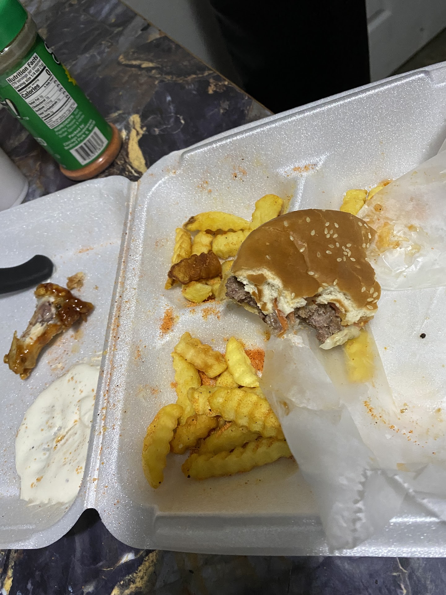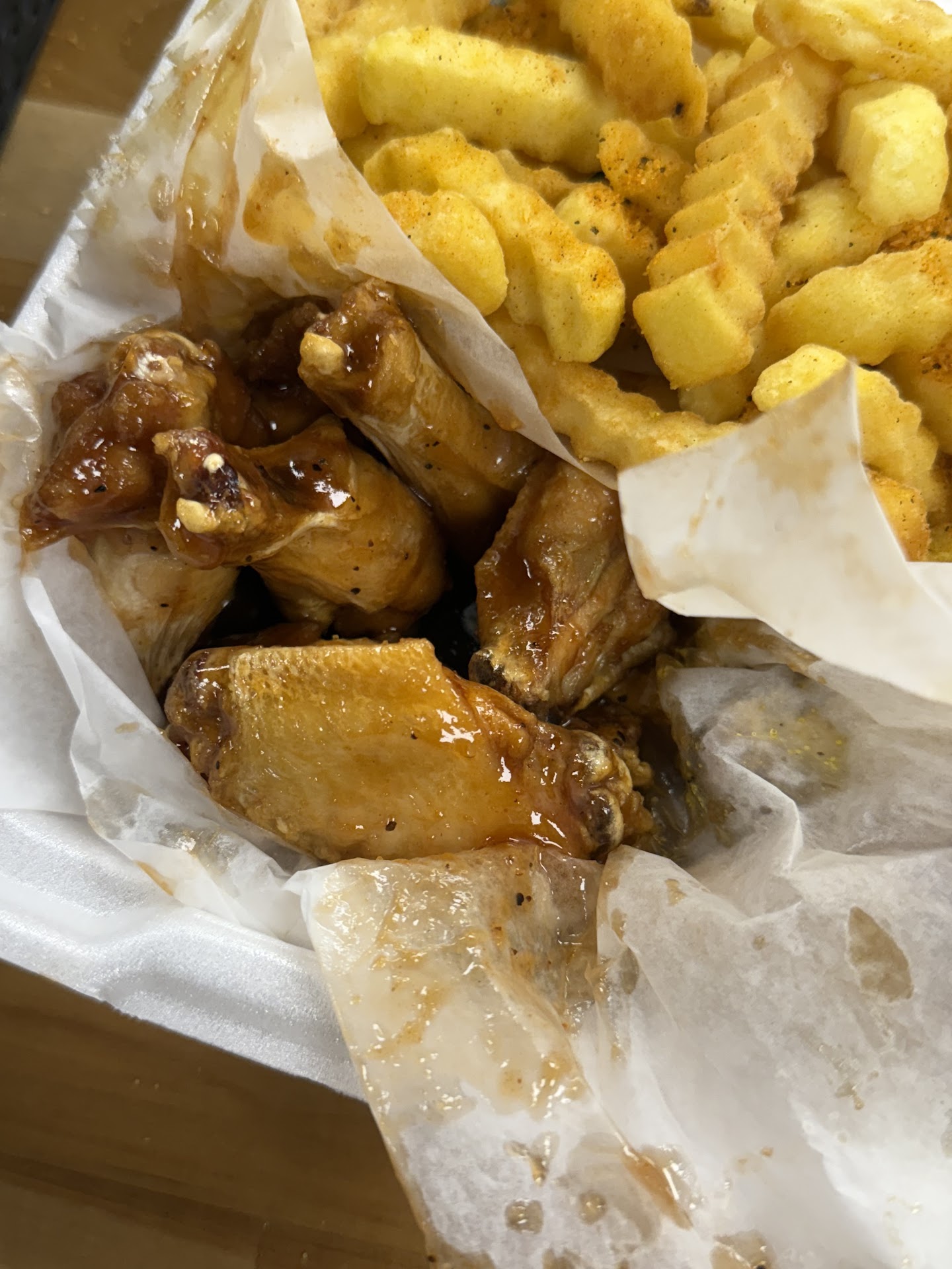 But the food….we ordered chicken teriyaki with veggie and rice, another one “all the way” which just means chicken, shrimp and steak.. the steak was inedible. & my husband would eat anything.. but could not stomach this We ordered 12 wings and fries: they were supposed to be “sauced” but YOU CAN TELL that they drenched the wings in BBQ right on the to go plate. Only the top of the wings were completely covered and the bottom was plain/dry.. and there were glops of bbq everywhere. We also ordered the plain tenders and wings...