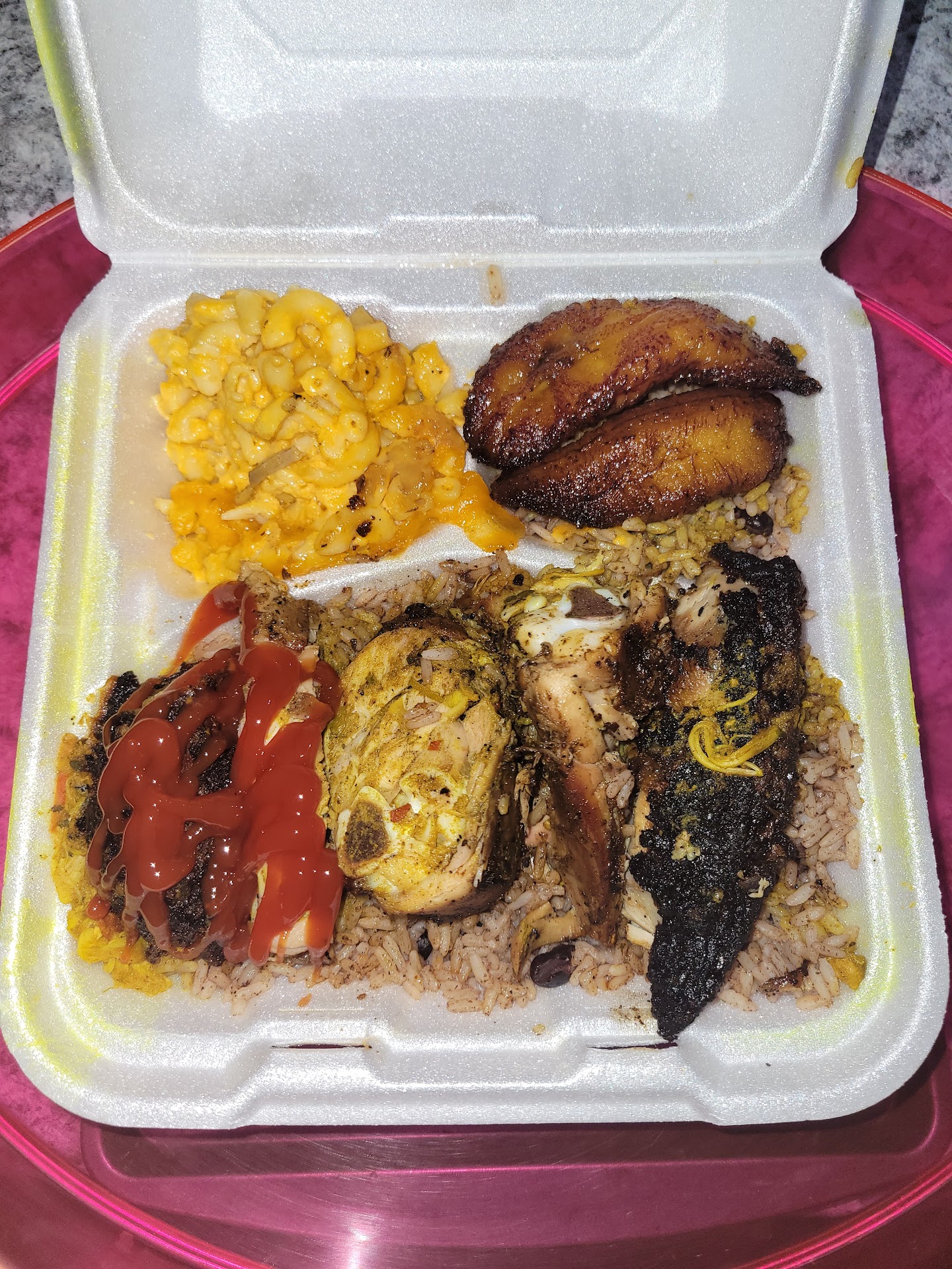 Got jerk chicken with rice and peas and mac and cheese with curry gravy on my food.... it was delicious. Got another plate of jerk chicken with rasta pasta, rice and peas and oxtail gravy... it was delicious but spicy. Only downside is that the rice and peas was lacking, it just was not that good of a rice and peas I was hoping for. Got there around 2pm after the lunch rush and my food was not warm, luckily we got it to go so we just reheated at home.