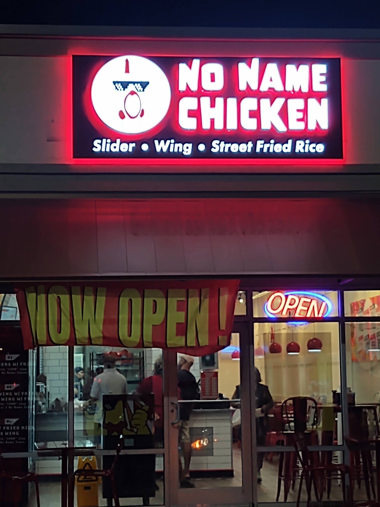 Read moreMy boyfriend and I tried out “No Name” this evening because we heard such rave reviews. I was highly disappointed and so was he. We did notice upon arrival that they were extremely busy, we are patient and didn’t mind waiting (took about 20 minutes between us deciding what we wanted and receiving our food). I ordered the 12 piece lemon pepper/hot peach, and he ordered the lemon pepper/peach bbq. The orders came with fries and some sort of slaw, and we also ordered a side of rice, the total was around $35.00 and $42.00 with tip. The cashier LeLe was patient and kind, however she did not know much about how any of the food taste which was not helpful in our decision making, but still that’s no deal breaker. Once we ordered we stood off to the side, once we received the order LeLe had us to ensure accuracy and bagged our food and provided condiments. Once we got to the car we dug into the fries which were good, honestly not much better than Ore Ida, but good nonetheless. We both tried our lemon pepper and were taken back as they were extremely salty. I should have asked for them to be extra crunchy, while they were already not our cup of tea….. them having the tough skin just make us put them to the side. I tried the hot peach wings and they did have a good level of heat, but I tasted no peachiness. They were a 4/10. My bf did say the peach bbq was good though. Overall because of the small amount of time it took to receive our order (even with them being extremely busy) I am ranking them a 4/10. It’s not my cup of tea and we wasted $35.00 because we had 1 wing of each flavor, ate the fries, and threw the remainder in the trash. The rice was hard and lacked flavor. All of that does not take away from the atmosphere. The employees are nice and offer fast and...
