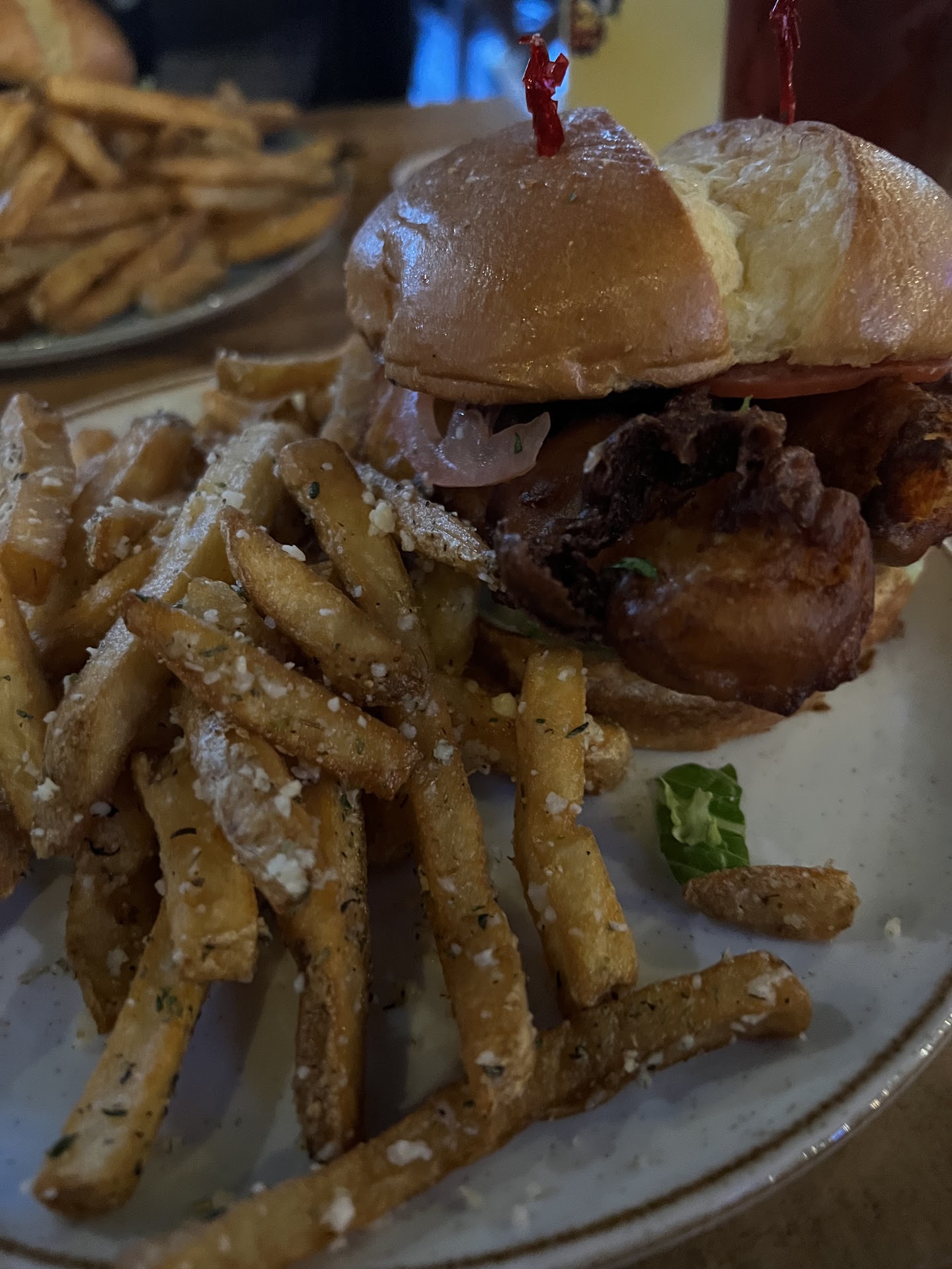 Read moreThe only positive thing I can say is the fries were good. I agree with other reviewers that ordering at the bar is uncomfortable. You have to reach around other patrons for a menu. I wanted ice water because I was the designated driver, and was directed to serve myself at station over by the kitchen. It consisted of stacked plastic glasses, and 2 open pitchers of water. Hello germs! One was nearly empty. They were both room temperature, and not one ice cube in either pitcher. Had to get my own straw. We had to tip when ordering before we got the food and drinks. So, no matter the service or quality of food, you've already tipped them. And we were not given any silverware. The burgers and fries were served in a cramped metal basket, all squished together. Please, put them on plates! When you pick up the burger, the fries fall over into the burgers place. And if you put down the burger between bites, you have to set it down on top of the fries because there's no room. The napkins were a roll of cheap paper towels. All of of our burgers were undercooked and raw in the middle. We took them home and fed them to our dogs. Three burgers, one appetizer, and two draft beers, with prepaid tip,...