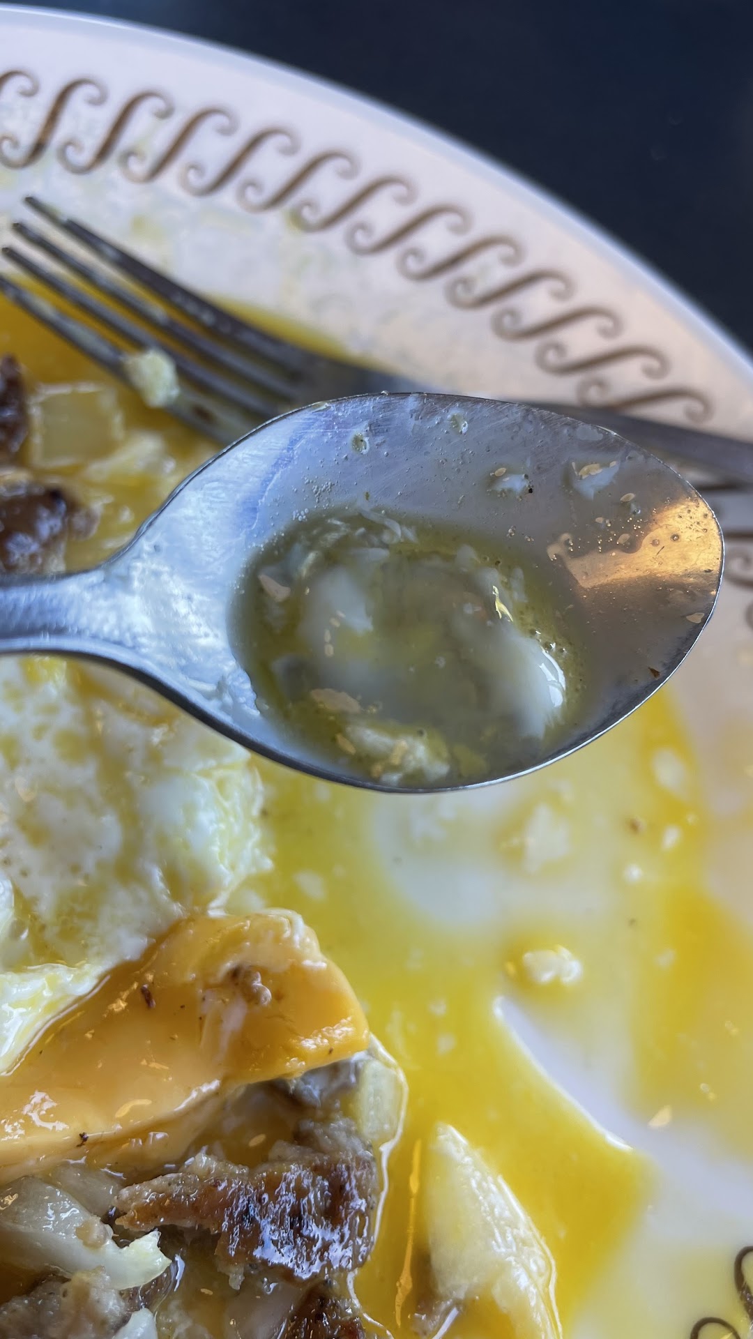 In the interest of not waiting another 40 minutes for them to cook two eggs, I separated the egg whites that were still snotty and raw from my mostly cold eggs and just made it work. The sausage was dry and over cooked, but again - I’m not spending my entire day getting my food remade over and over.