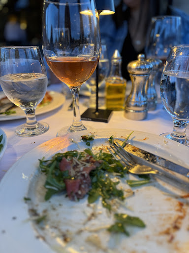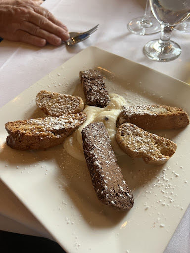 The food was delicious, expertly prepared, and generous portions. The mussels fra diavolo were one of the best we've had, and the tri colore salad was wonderful. The diver scallops, veal chop, and branzino entrees for dinner were superb. The tartuffo and assorted biscotti for desert were terrific.