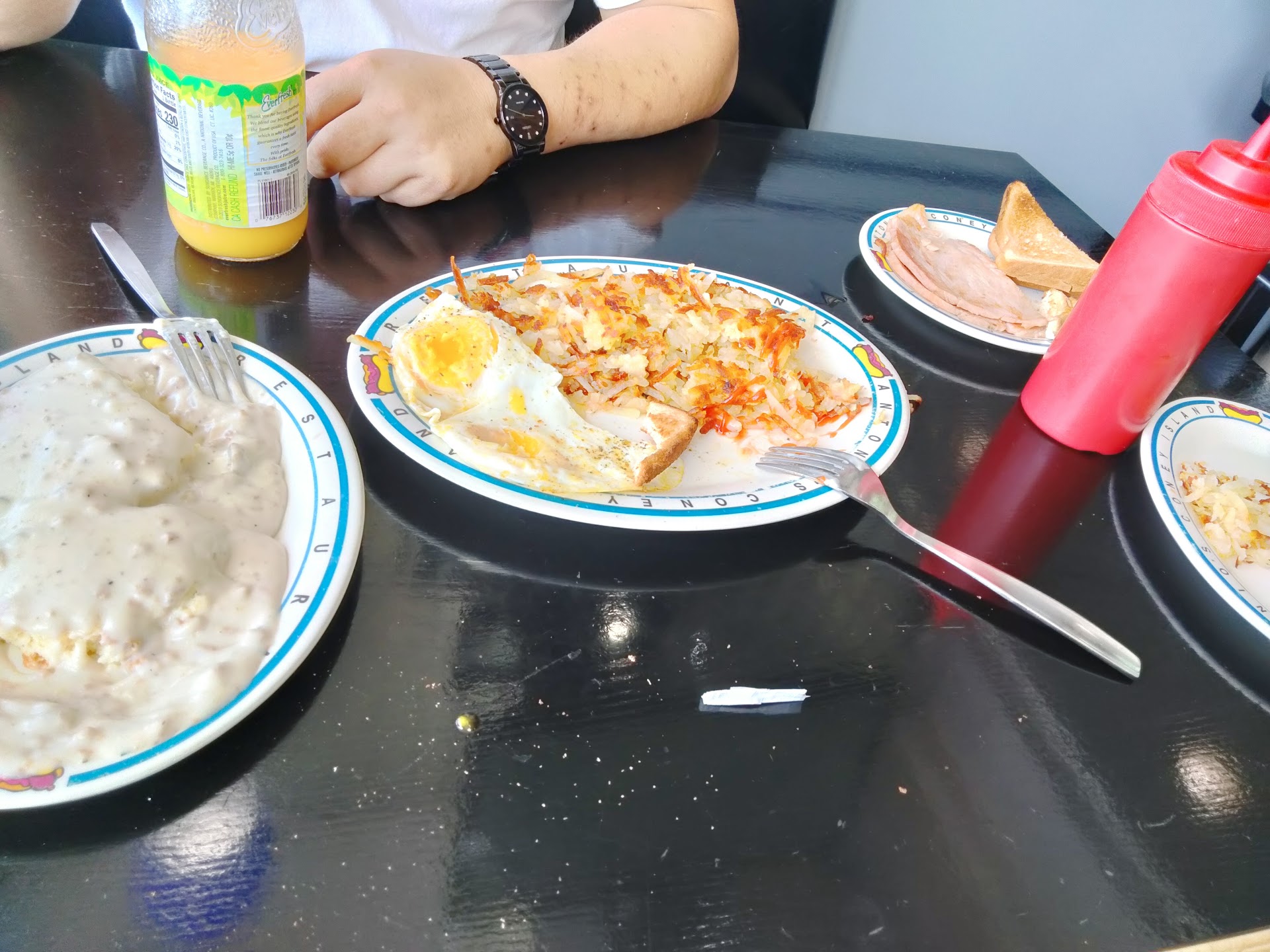 We came here since Loris was closed for the week and... Well, the eggs and toast were edible even though the eggs were over cooked. The biscuits in the biscuits and gravy were doughy and disgusting. The ham? Inedible. Too chewy, stringy even. The hash browns? Bleh. And the Bugs! Bugs everywhere! Fat, bigger than gnats, bugs!! Everywhere. One landed right in our hash browns, then I counted three more just on the window buzzing around. I tried to scoop it out and keep going but honestly that was the final straw. We had to go up to the counter because we waited so long and we just wanted our bill and to leave. The only reason I gave more stars for service is because they seemed genuinely shocked when we said the food was horrible and told us since we barely touched it to not worry about paying. That I appreciated at least. Too bad I'm off to work hungry now.