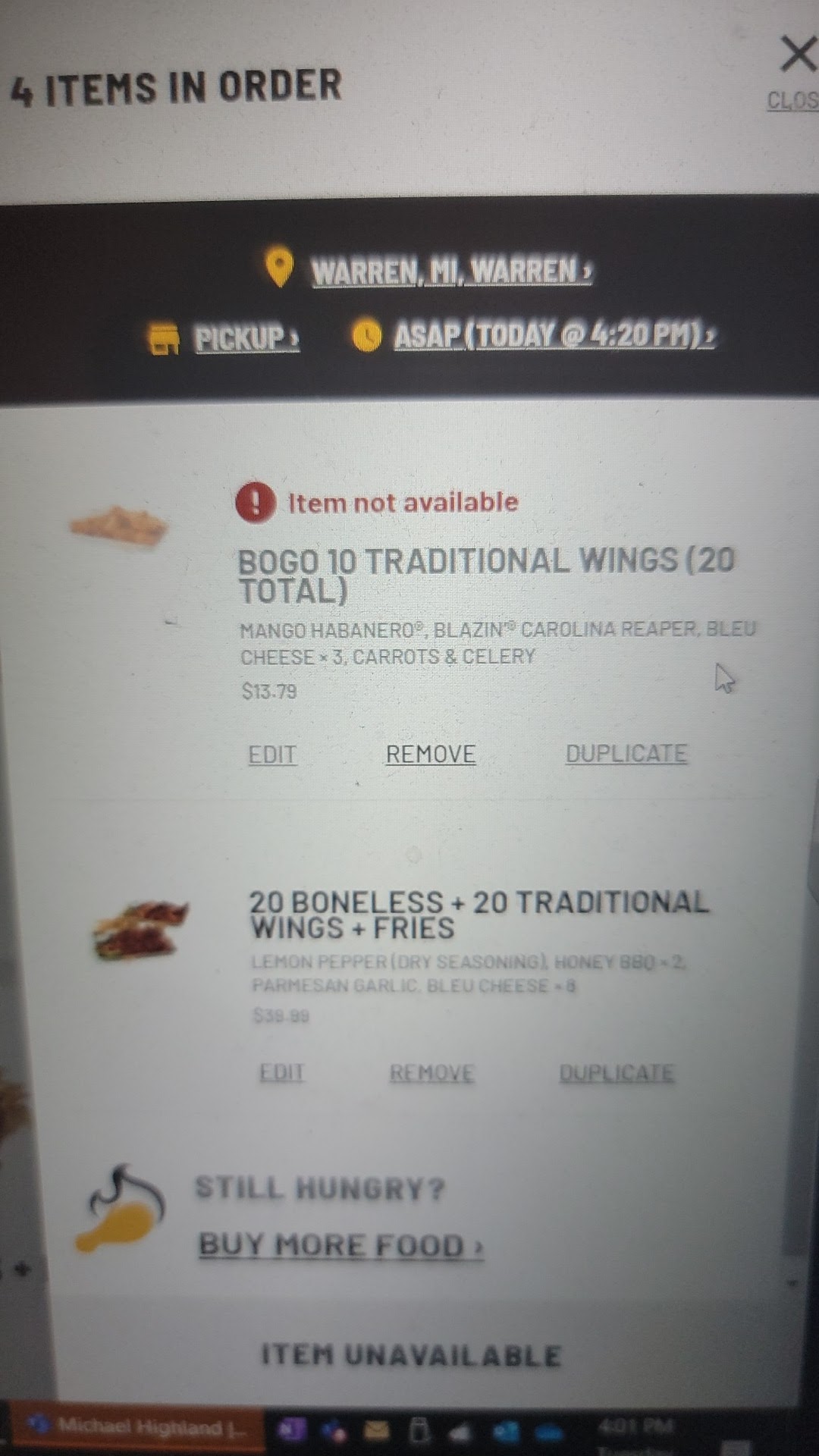 As of yesterday, 2/19/2019 a few good things have happened. First), I received a response from the headquarters asking me to call them to discuss above review, which I did call back within a few days. But before calling them, secondly) mysteriously I received a handwritten envelope in the mail from the BBWās I reviewed. Inside of this was simply a hand written $10.00 restaurant credit made out to āour guestā (I think, forgot). Third, yesterday I called in an order of small traditional āAsian Zingā and the āBOGOā ordered āParmesan Garlicā. Went in giving them an extra 5 minutes I was greeted enthusiastically by one of the managers, he happened to be walking into the carry out service area. He asked to help me and went right onto the register collected my ācreditā and the extra difference in cash and within a minute or so the nice pleasant young lady brought out my order. As I was still taking care of Bill I went right towards her as she began to show me my order and explaining where the extras were as well ample napkins and wet wipes. I have to say, THIS PARTICULAR VISIT WAS 5 STARS * ALL AROUND, FROM THE GREETING ON THE PHONE TO BEING HANDED MY CARRY OUT ORDER!!! I knew they had it in them. Now just keep it up. In the end, I have to say I did not go to competition, yet, but will definitely be back to the Warren Michigan store in the near...