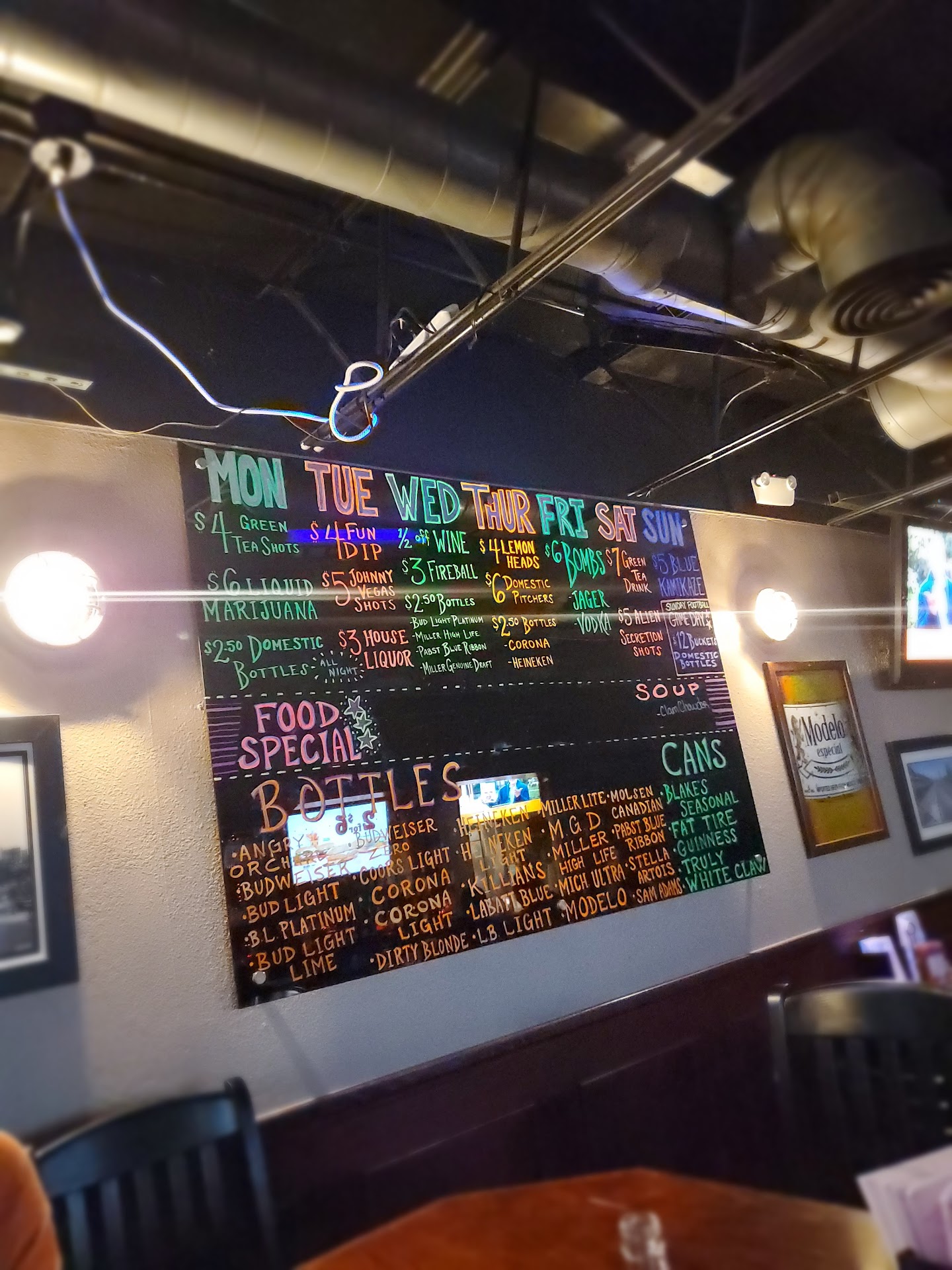 Plenty of TVs all over the place along with large tables perfect for groups & plenty of bar seating so perfect to watch a game. There's a parking lot on the side of building with free parking too. There was only 1 bartender working who managed both the bar and tables, and she did a very efficient time making sure all guests were tended too in a timely manner. Oh and did I mention they have a board with a long list of daily drink specials that will pique your interest (on Mondays you can get Liquid Marijuana for $6!). Can't wait to return to try my wings...