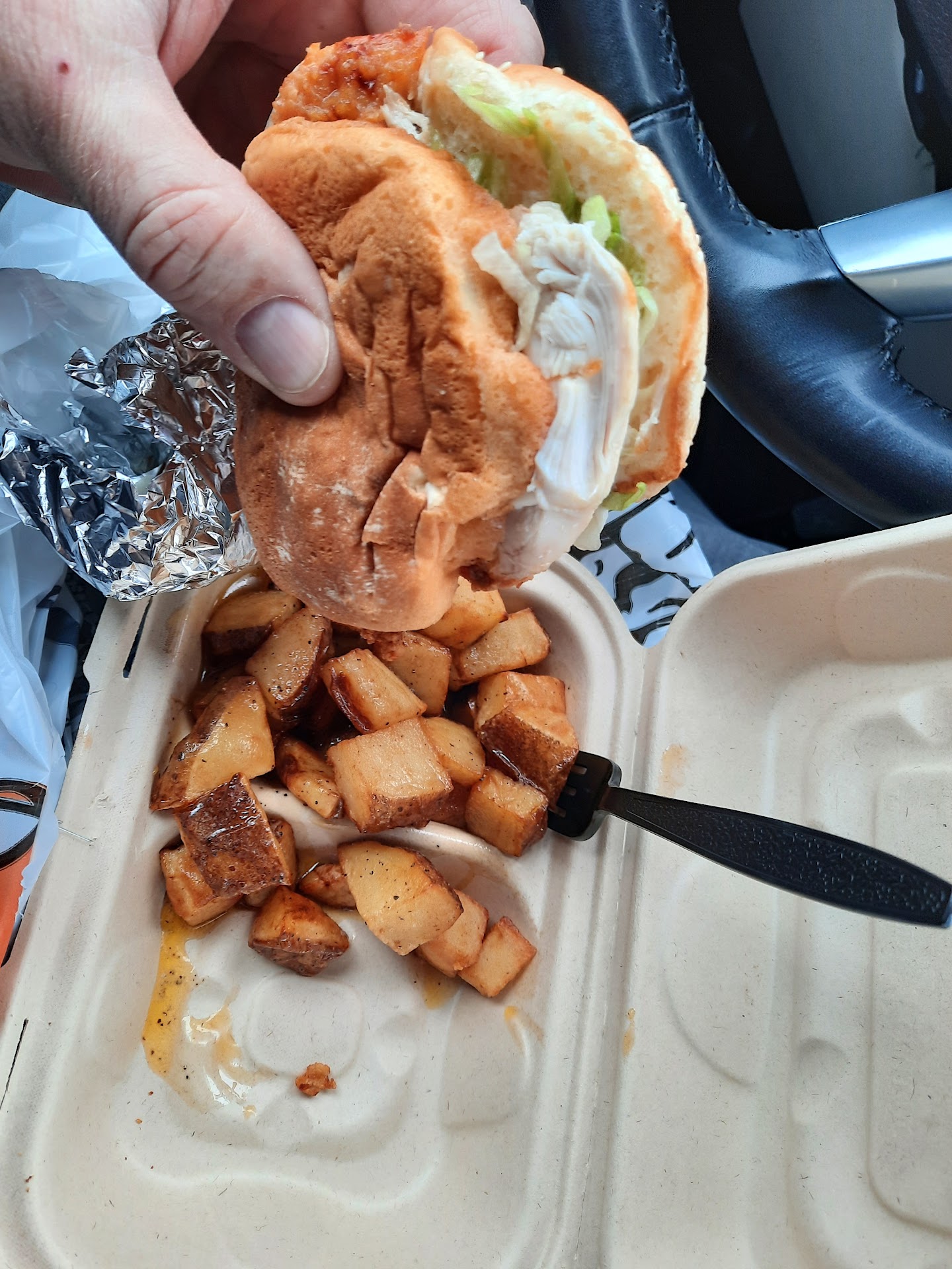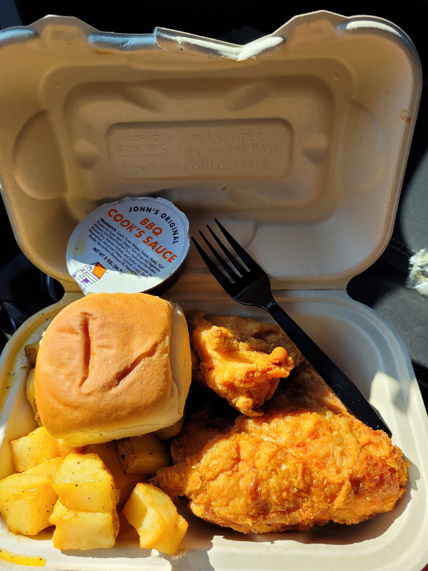 Read moreThe only good thing about this place is that the employees are nice. I just got home with my order and it is totally inedible. Very disappointed! Very upset. *The chicken isn't crispy and was missing about half the breading on 1 of the 2 pieces on my 2 pc snack. Then when I went to take a bite I noticed how tough and fibery it is. Almost like it wasn't cooked all the way through. Not eating it. *Chicken tenders on the 5 pc dinner were so dry, we had to use scissors to cut them up!! *The potatoes aren't cooked and could be mistaken for being boiled they're so soft and soggy. *I asked for extra butter. None given. *Asked for extra BBQ sauce ON my husband's chicken tenders, none given. *The coleslaw has an odd fermented smell that isn't the smell of cabbage in a coleslaw. It too, is dry! Even after mixing it, trying to bring up some of the liquid that may have settled, we realized there is NO extra liquid!!! Its literally like sawdust. It's 7:30p and we would guess this coleslaw has been made earlier in the WEEK for it to smell this way.