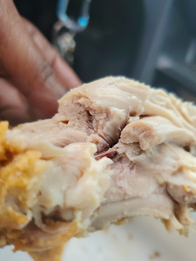 Worst of it all. My food looked good but was not good. And, was still red by the bone of the thigh and still pink by the bone of the leg - so it wasn't fully cooked.