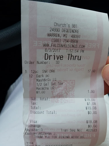 Read moreFor many years, there used to be a Church's restaurant on 16 Mile & John R (I live in Troy) which operated in the same space as a local White Castle, but for whatever reason it went out of business. Because of that, I decided to come to this location for my online order, being that it is now the one in closest proximity to where I live and I hadn't been to a Church's in years. I came here once a few years ago. I was very disappointed. I ordered the four piece meal (two breasts, two thighs, and the complimentary side dish and beverage). The French fries were excessively greasy, and the chicken was mediocre at best. I threw it out. Not only that, but the atmosphere was dreary and depressing. On a side note, why would anyone want to open a restaurant franchise next to a U-Haul plant?