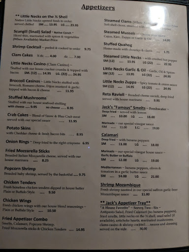 I've being going to Jack's for years. I went a lot as a child and teenager and here and there as an adult. Always a good restaurant but regrettably I forgot it's there in nearby Warren R. I. and hadn't been in a long time. Well it was Friday and I was in the mood for Seafood. My usual spot was booked solid so I googled Seafood restaurants near me. Happily Jack's came up in the search so I checked out the menu and wasn't disappointed. Not only did they have a LARGE selection of seafood but a large selection of everything else from, steaks and chicken to great pasta dishes. Moving along, I went to Jack's with my son and my brother; I had made a reservation ahead of time. We got there and we're greeted by a very friendly waitress who promptly brought us to our table. I was there for seafood. I started with Scungili (Snail salad) it was delicious one of the best I've had. If your not familiar with this dish it Conch sliced thinly in a vinaigrette sauce with fresh greens and some garlic. It's a dish that's tough to find but as Jack's is primarily an Italian restaurant it's a staple there. Next up was my choice of entree. I was leaning toward the lobster, boiled, baked stuffed or grilled were my choices or a clamboil, consisting of soft shell clams, sausages, hotdogs, chourico, corn on the cob,potatoes and an onion. At first I went with the clamboil as my choice, only to be reminded by my brother that it was lent so all the good meat fixins' would be a no, no, for my Catholic faith. Damn! Uh oh so much for my faith. So reluctantly I decided to give the menu the once over again. Although the lobster was my second choice, I wasn't in the mood to wrestle with my food with nutcrackers to get at the succulent lobster meat encased in their bright red armor. Stuffed fish was on my mind but I didn't see it on the menu with the many other fish dishes. However to my delight when I questioned the waitress she informed me that they had a baked stuffed sole as a special. So that's what I ordered. My son had Jack's famous Seafood special, a pasta dish with a white clam sauce and lots of different seafood while my brother had the seafood casserole along with calamari as an appetizer. ( You can order it 3 different ways) My snail salad came first and it was the best, we all enjoyed it. The calamari arrived shortly afterward. It consisted of the squid rings with sliced banana peppers with a butter garlic sauce on the side. My brother enjoyed it but thought it was a bit blah. I agree it should have had more peppers maybe add in a couple of red hot cherry peppers to give it a little kick. The garlic butter sauce was excellent but still the dish could have been better if it was a little spicier. My son's famous Seafood special didn't disappoint, 1/2 pound of pasta with a plentiful amount of seafood in a tasty clam sauce. A one pound version is also available , but half a pound is more than enough for one person. My brother's seafood casserole was tasty with, lobster, scallops, large or jumbo sized shrimp, scrod and crab in a seafood sauce with bread crumbs. He really enjoyed it but to his knowledge rated 2nd to an undisclosed restaurant that only he knows about. All in all we were very satisfied. The service was great. Our waitress was friendly, informative and prompt. The food was delicious and reasonably priced, the variety of food was excellent. The decor was cute, nothing elaborate but warm and friendly like a FAMILY restaurant should be. I had a side salad as one of my options with italian dressing. The salad was great, mixed greens and other garden delights but I would get something other than the Italian dressing it too was a little bland for my taste but I'm sure with a different dressing it would have been delicious. Aside for some minor condiment issues we were all very impressed with Jack's and I won't be delaying my return back. For quality food at a good price and a selection that provides something for Everyone, Go to Jack's you won't be disappointed, you'll...